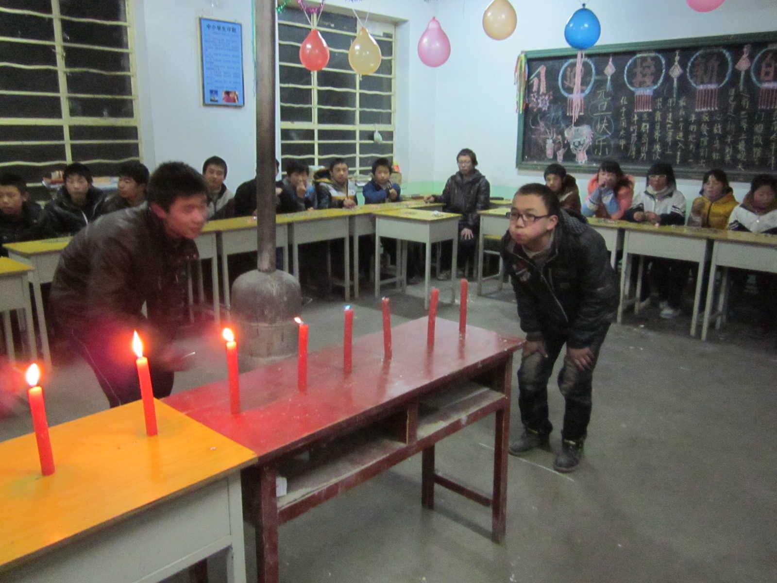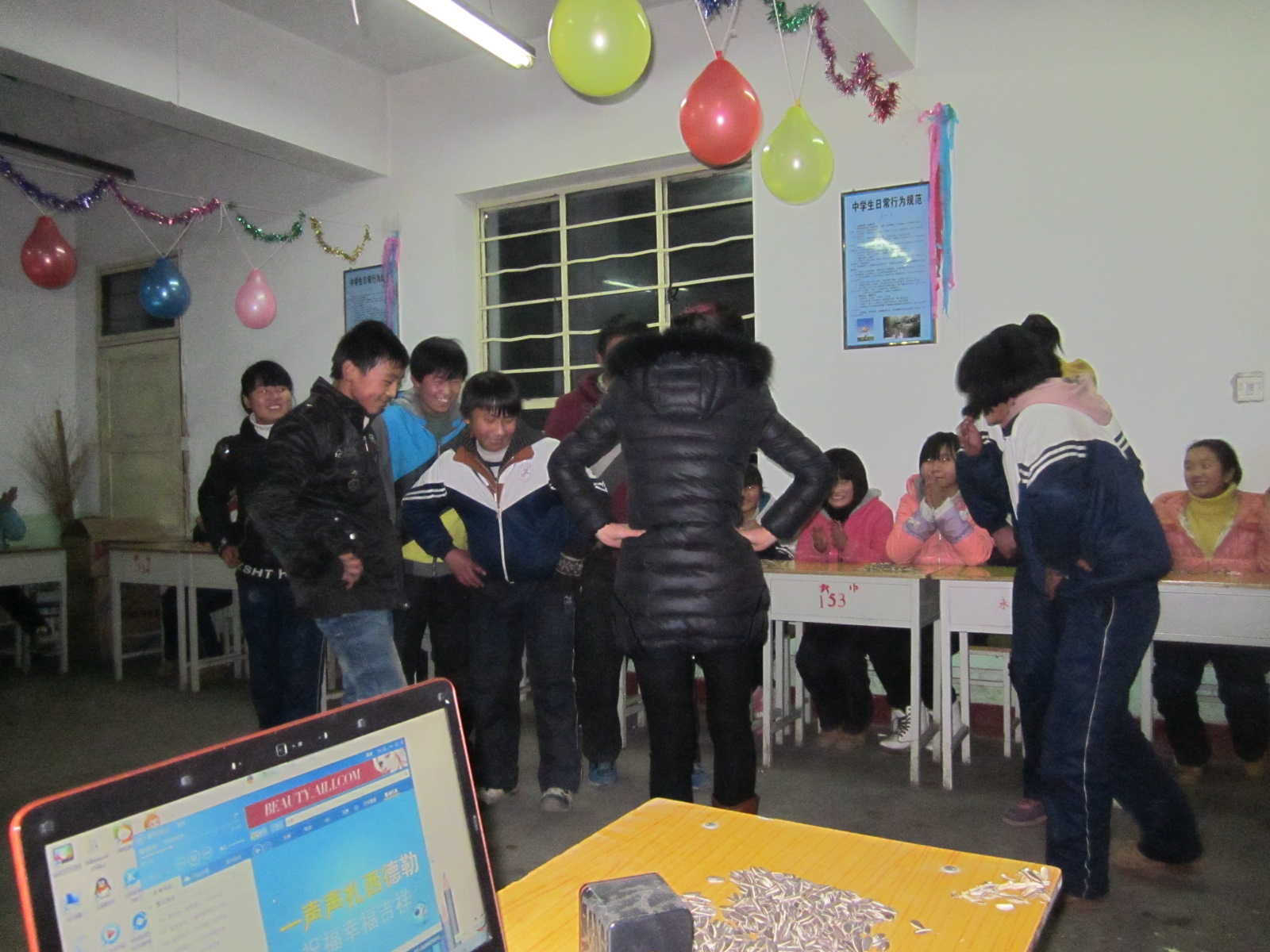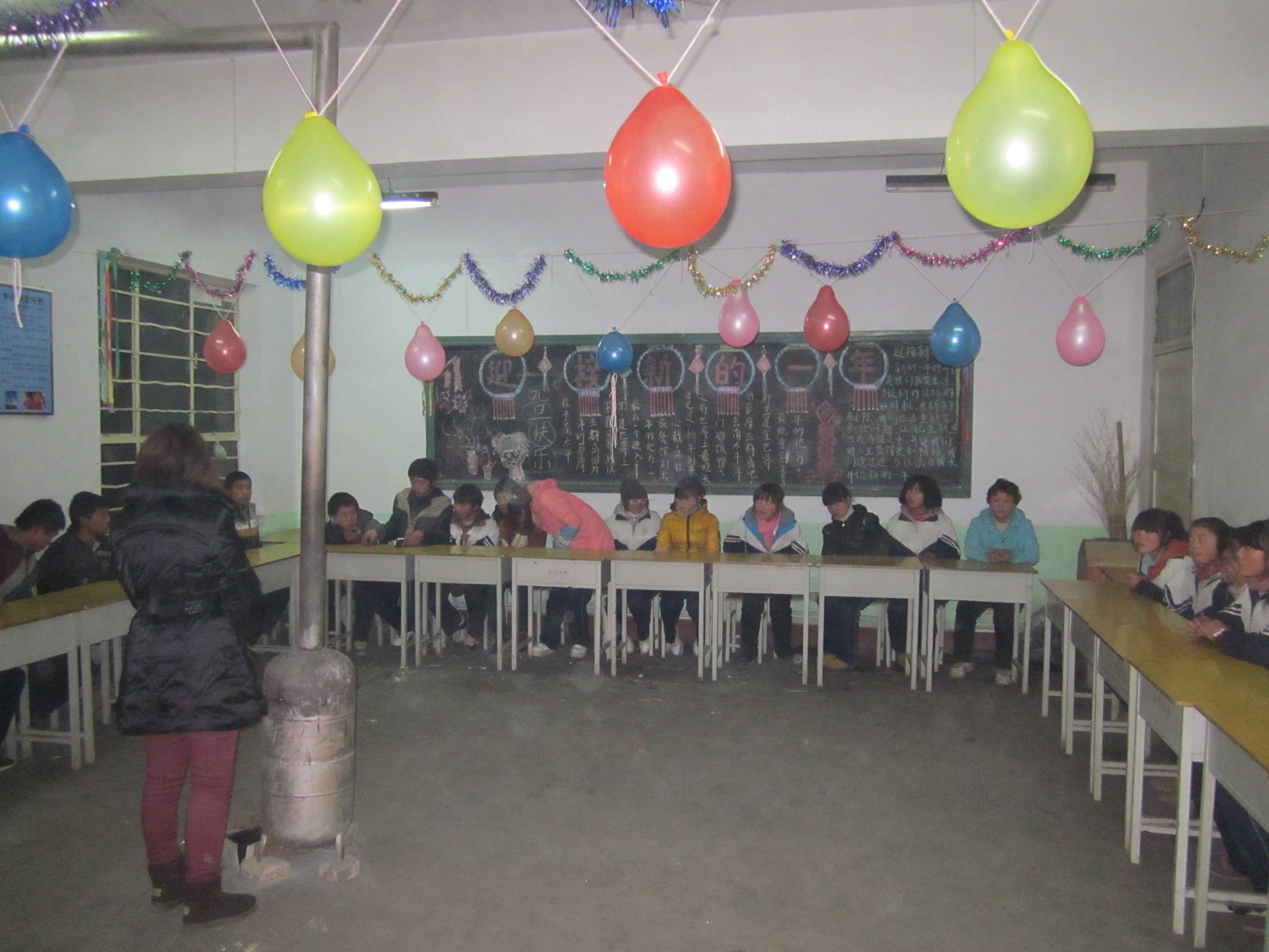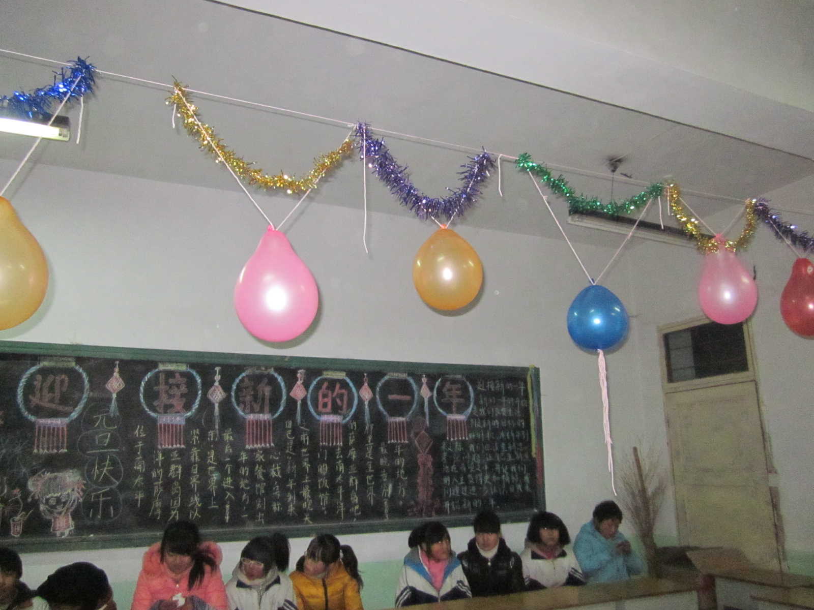一眨眼三个晚自习过去了,我们班的跨年夜也过了,我们依依不舍的离开了教室,可是教室还在过节,你瞧,还有彩带、彩球,这时,我们仿佛听见了教室还在持续那种开心的欢笑声。