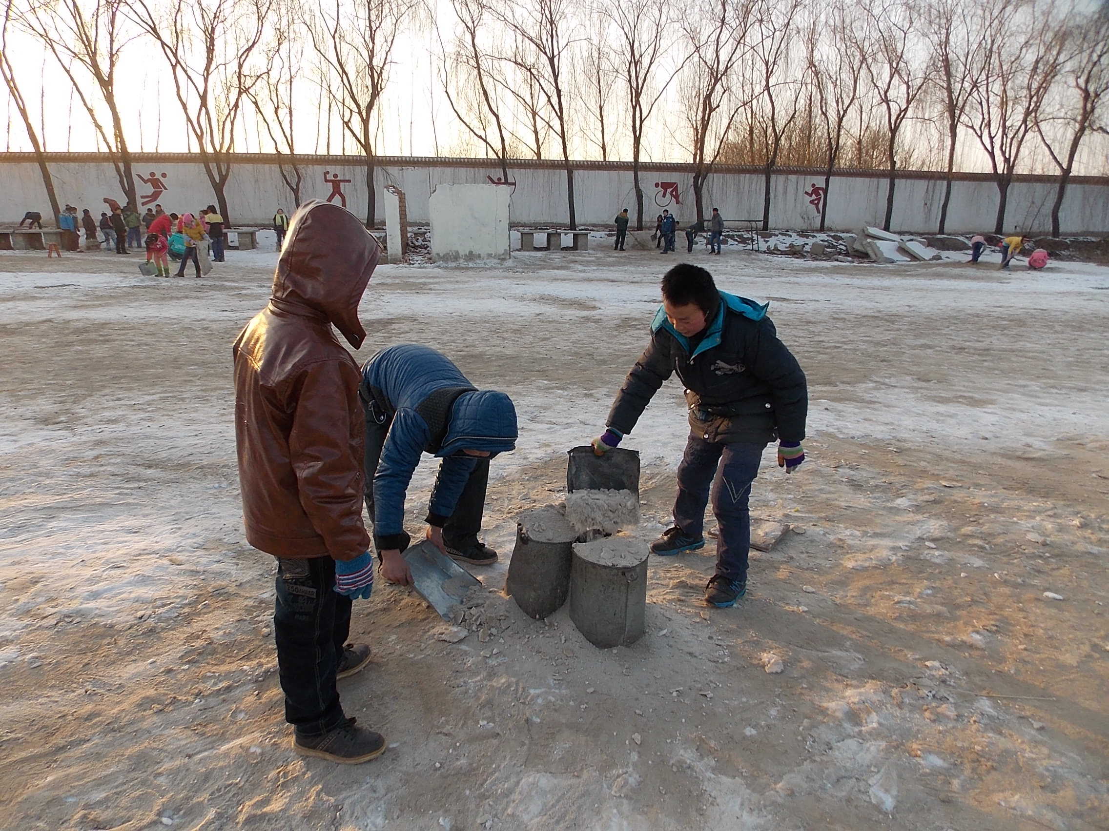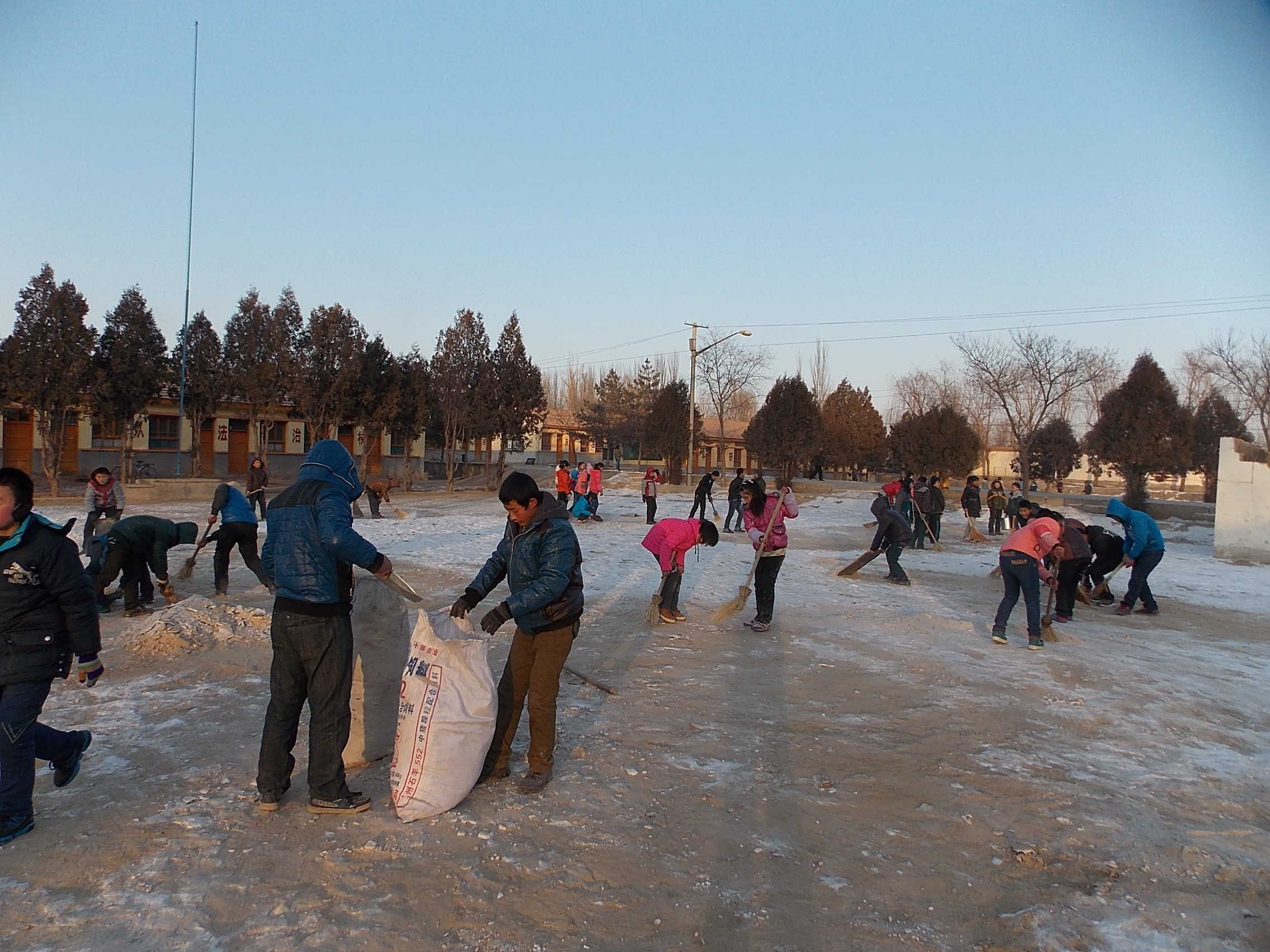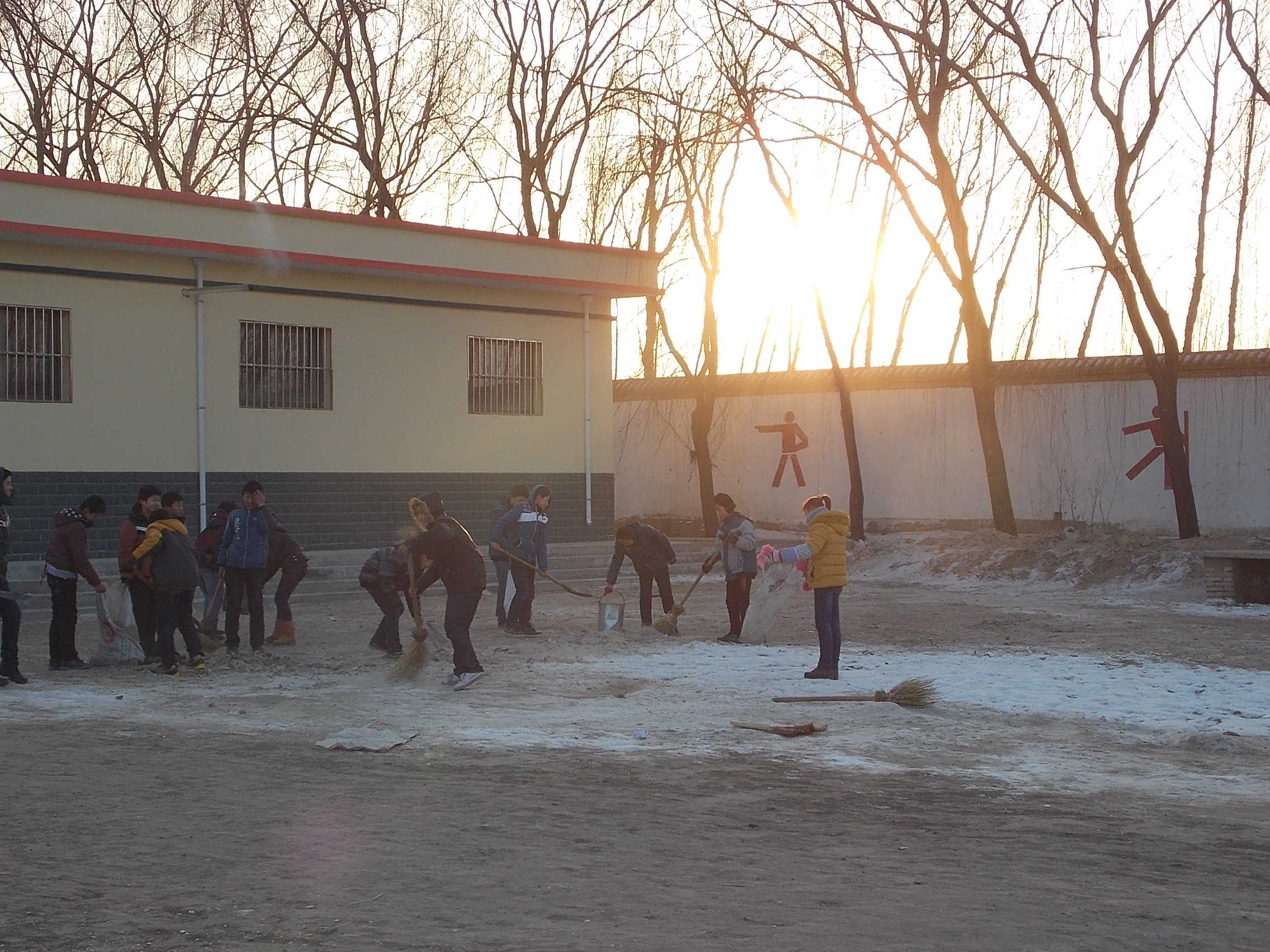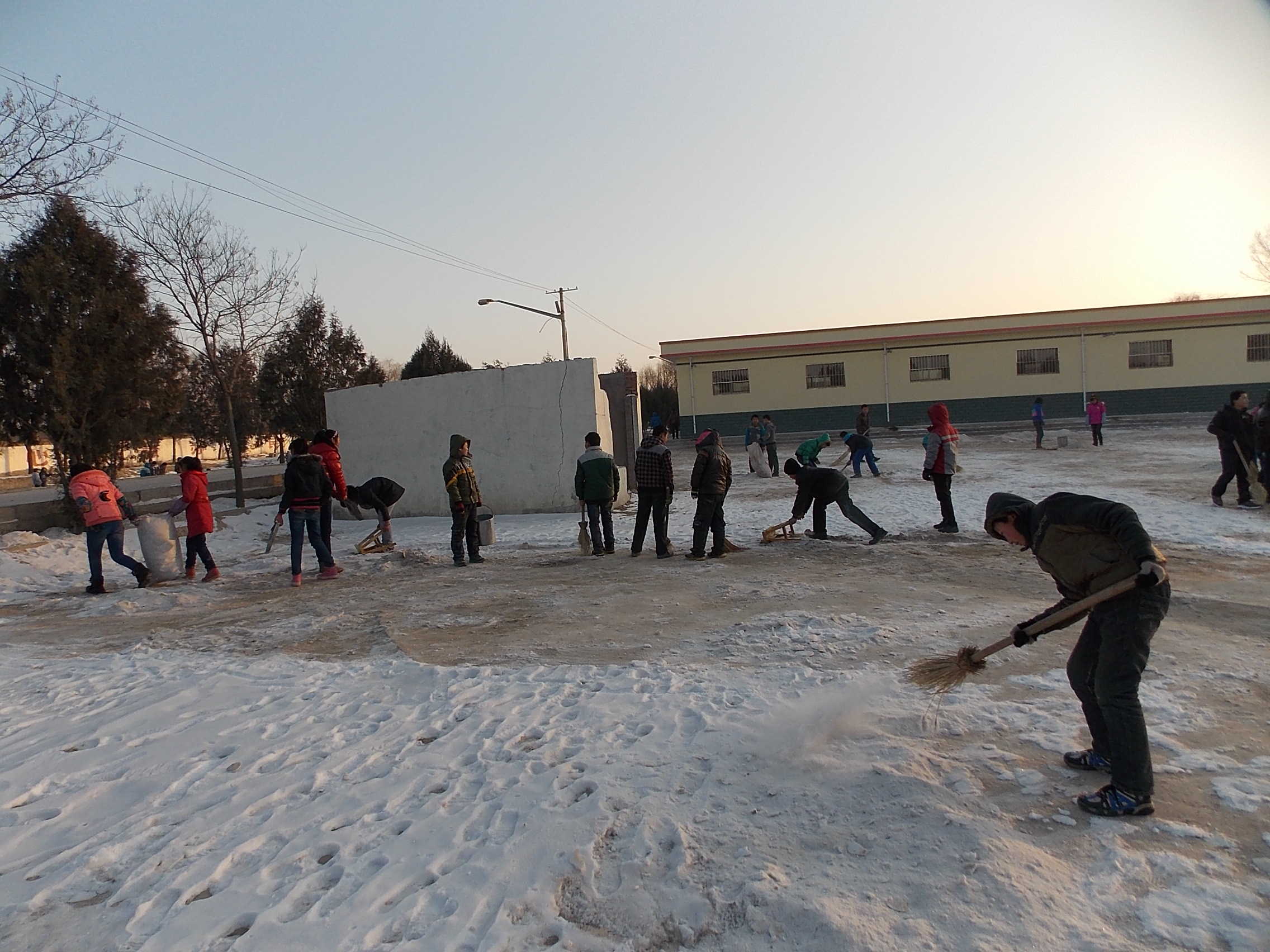 这时同班的几个同学看见了二话不说便来帮我。最终在我跟几位同学的不懈努力下,这块“硬骨头”总算解决了,再看看旁边的同学都在卖力地清除着影响校园美观和同学们安全的积雪。