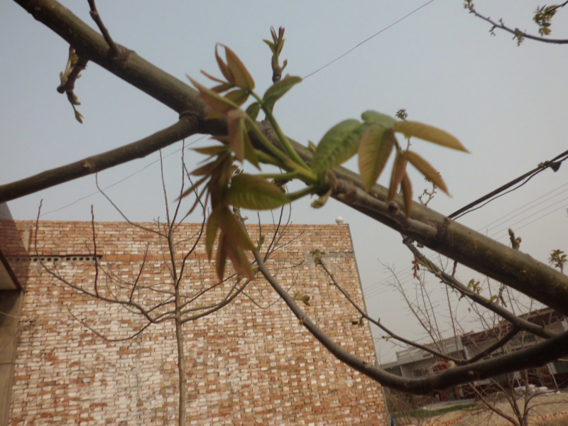 再往后走,就能看见一棵又高又大的核桃树,它也发出了新芽了。去年它没结出几个核桃,它今年一定要努力,你瞧它的芽,是那样的旺,不就是以后硕果累累的信号吗?