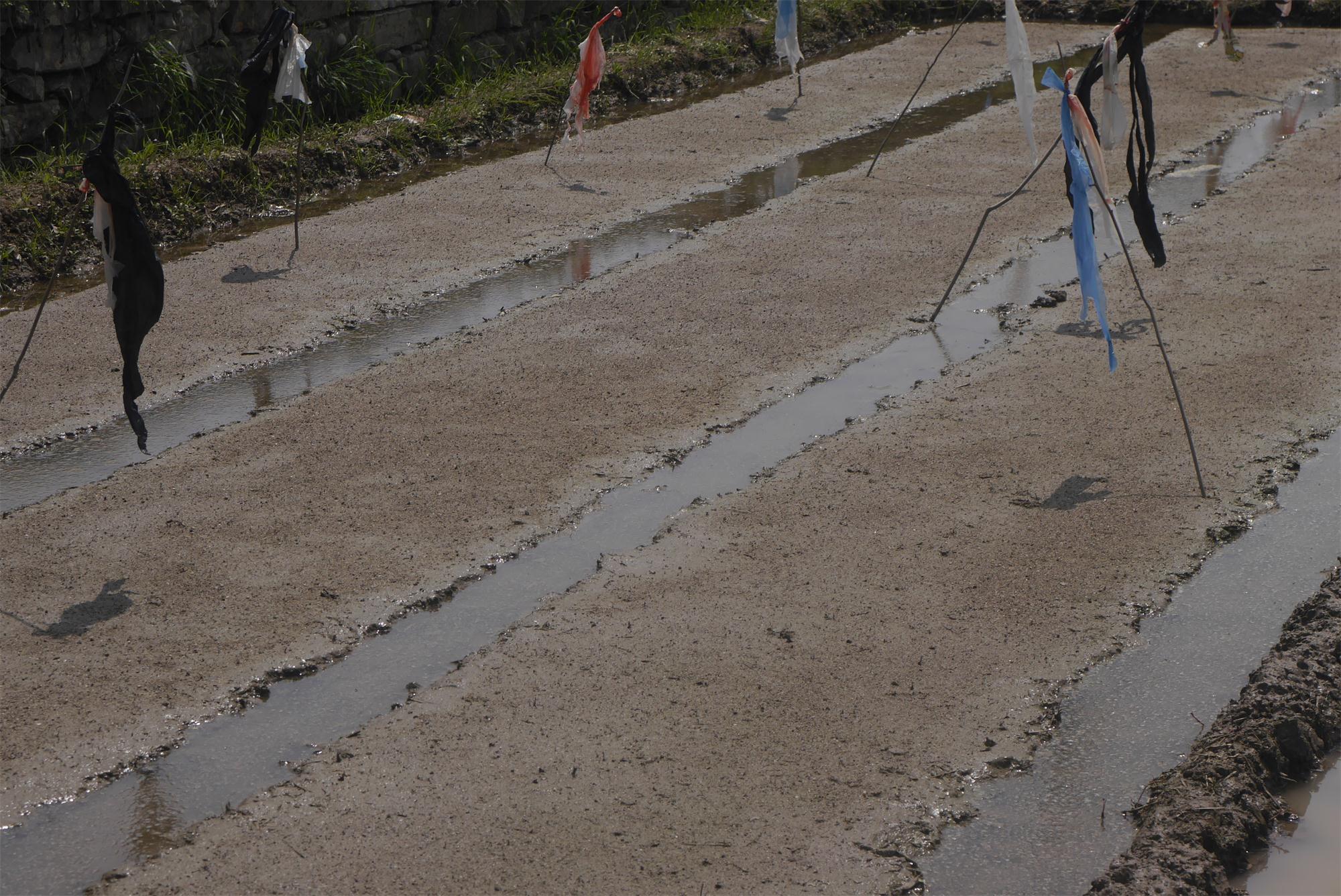 那边有个人正在用锄头把水田挖成了一排一排的,这我知道,这是做秧板。中间的小沟是存水的,也便于人管理秧苗时通过,我想这个工作应该就是育秧苗的第一步吧。那位叔叔挖好水沟后,又用一个木拖把挖好的秧板板面拖得平平的,我问叔叔为什么还要这样做,叔叔说这是便于均匀撒种和种子生长。