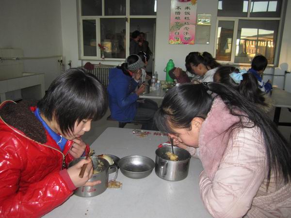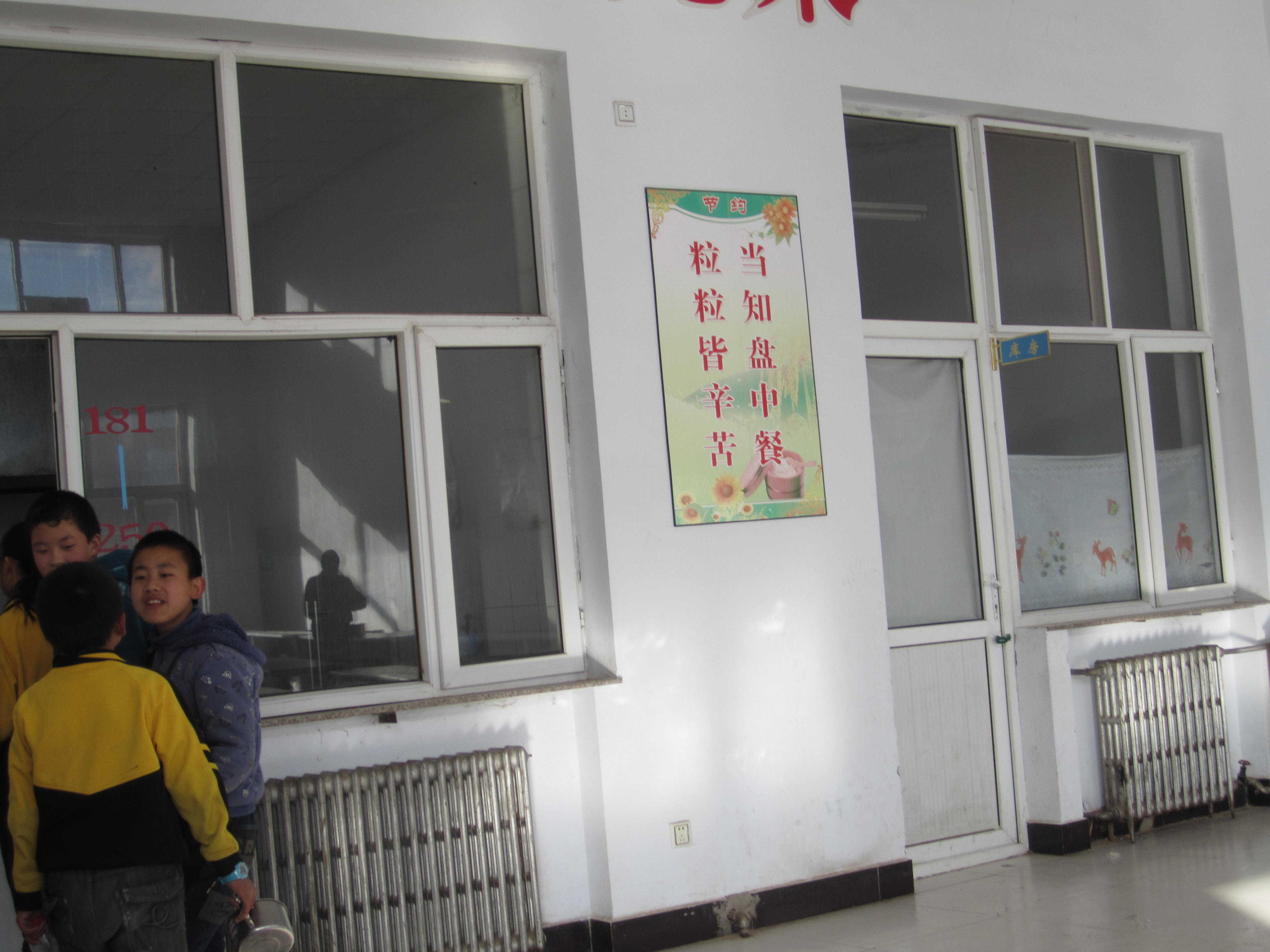 学校餐厅很大,屋梁上挂着几盏白炽灯。两面墙上错落有致地安装着几把大电风扇。左边墙壁上用大红漆写着:"生活的课堂,人生的考场。"右边墙壁上也用大红漆写着:"谁知盘中餐,粒粒皆辛苦"食堂大厅整整齐齐的摆放着25张不锈钢的大方桌,和相应的长凳。
