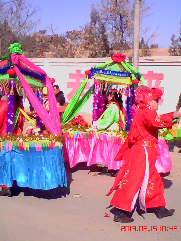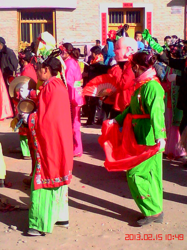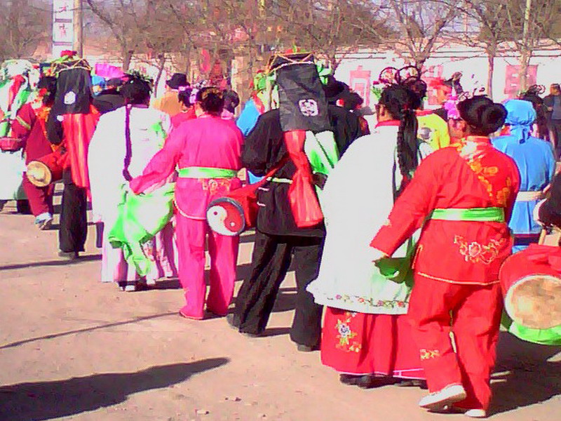 后面的尽是穿着花花绿绿的衣裳,拿着扇子跳舞的人。满眼的花色舞动着,有各式各样的人物:秀才、公子、俊俏的姑娘、丑婆婆神婆婆,哟,还见了个骑毛驴的人哪,爷爷说那是张果老倒骑毛驴,再者是那扭秧歌的人群,舞步两走一转,手中有节奏的摆动红布绿布,舞蹈像一把火一样,被人们的热情点燃······