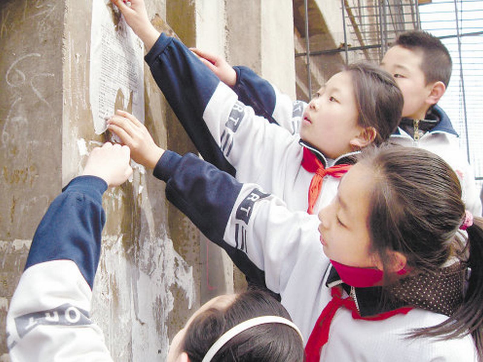 吃过午饭后,同学们就跟我去了目的地——校门。连日的沙尘天气把原本干净雄伟的校门吹得灰蒙蒙的。大家各自找好了不同的区域,决定要把校门擦洗的一尘不染,为我们可爱的学校增添一丝光彩!