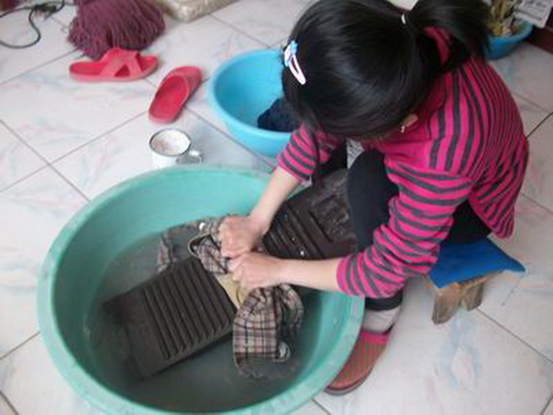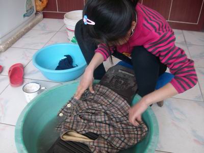 说干就干,我马上把衣服放进盆里,倒上了清水,把衣服泡湿了。然后又把洗衣粉倒进盆里,洗衣粉都粘在衣服上。怎么会这样呢?我左思右想,终于想到了,应该先把衣服拎起来再放洗衣粉,那样洗衣粉就容易融化了。