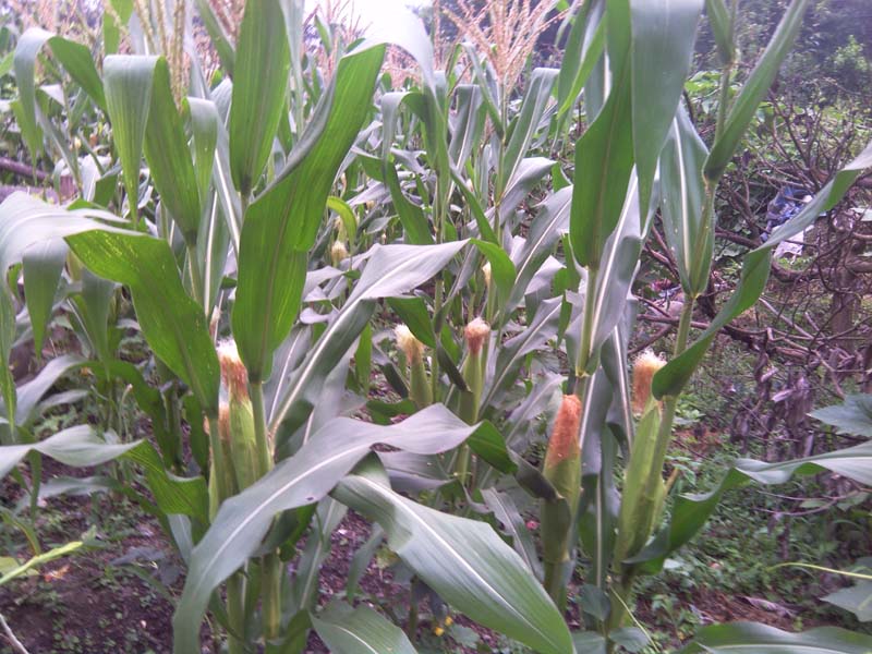 首先映入眼帘的就是一人高的玉米。玉米包谷长长的,它的头上戴着粉红色的玉米须,一看就知道是还未成熟的玉米,不过等不了多久,我就能吃到新鲜的玉米棒了。