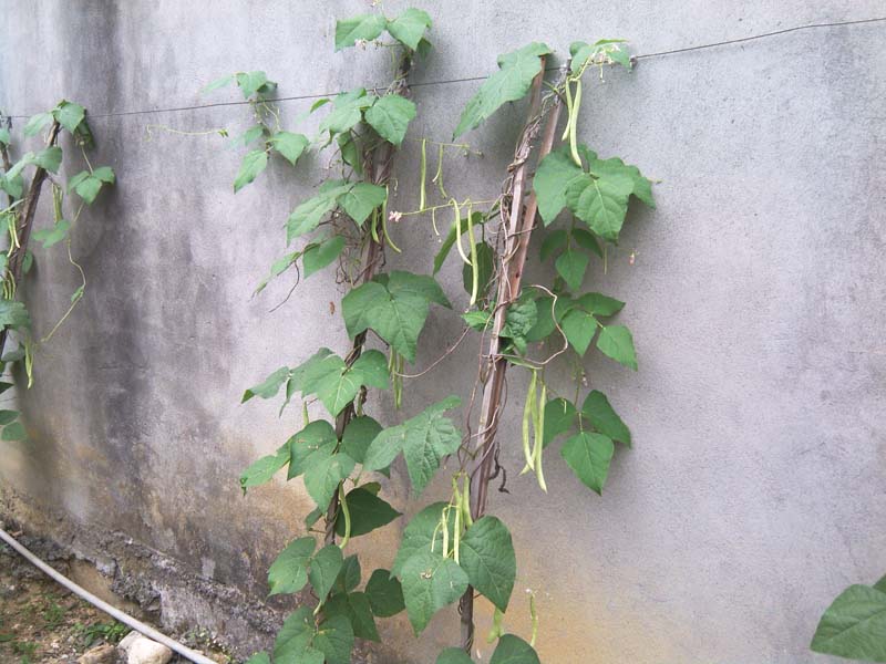 回转头一看,在墙边,爷爷靠墙边点上了一排四季豆。一根根四季豆藤儿顺着竹竿爬上了墙,一串串长长的四季豆挂在藤上,随着一阵风儿吹过,四季豆们轻轻摆动起来,唱起了丰收的歌。我不自觉地走过去,摘了一大把,准备好今天的晚餐。