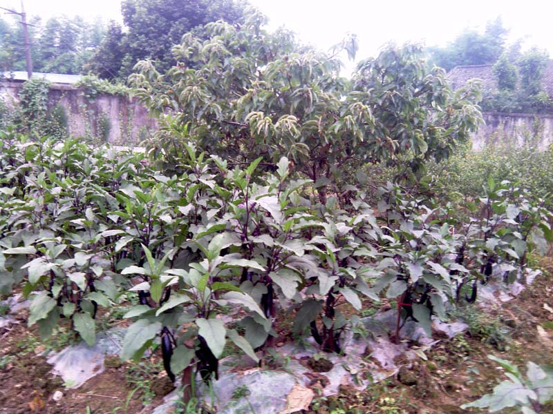 接着看过去就是一块茄子地了。在紫色的花丛中,每棵茄子树上都挂满了紫色的茄子,它们有的已经有一尺来长,可以吃了,有的半尺来长,有的才花谢,一个个都像是在竞相生长。我轻轻蹲下身子,采摘了几个成熟的茄子,准备好今天的午餐。