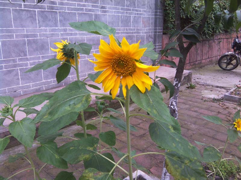 拐过房角,我又发现绿化树的小方格里,也被爷爷因地制宜地种上了向日葵。此时的向日葵正是怒放的时节,金黄的花瓣在绿叶的衬托下是如此的美丽,连蜜蜂、蝴蝶、蜻蜓都乐得停在上面不肯离去。