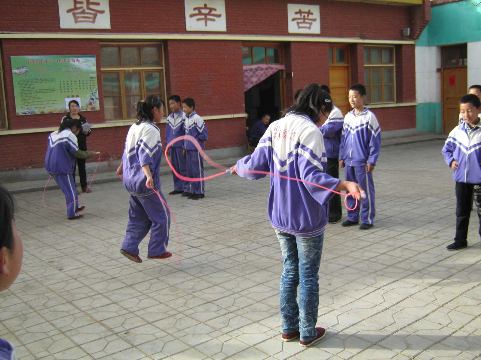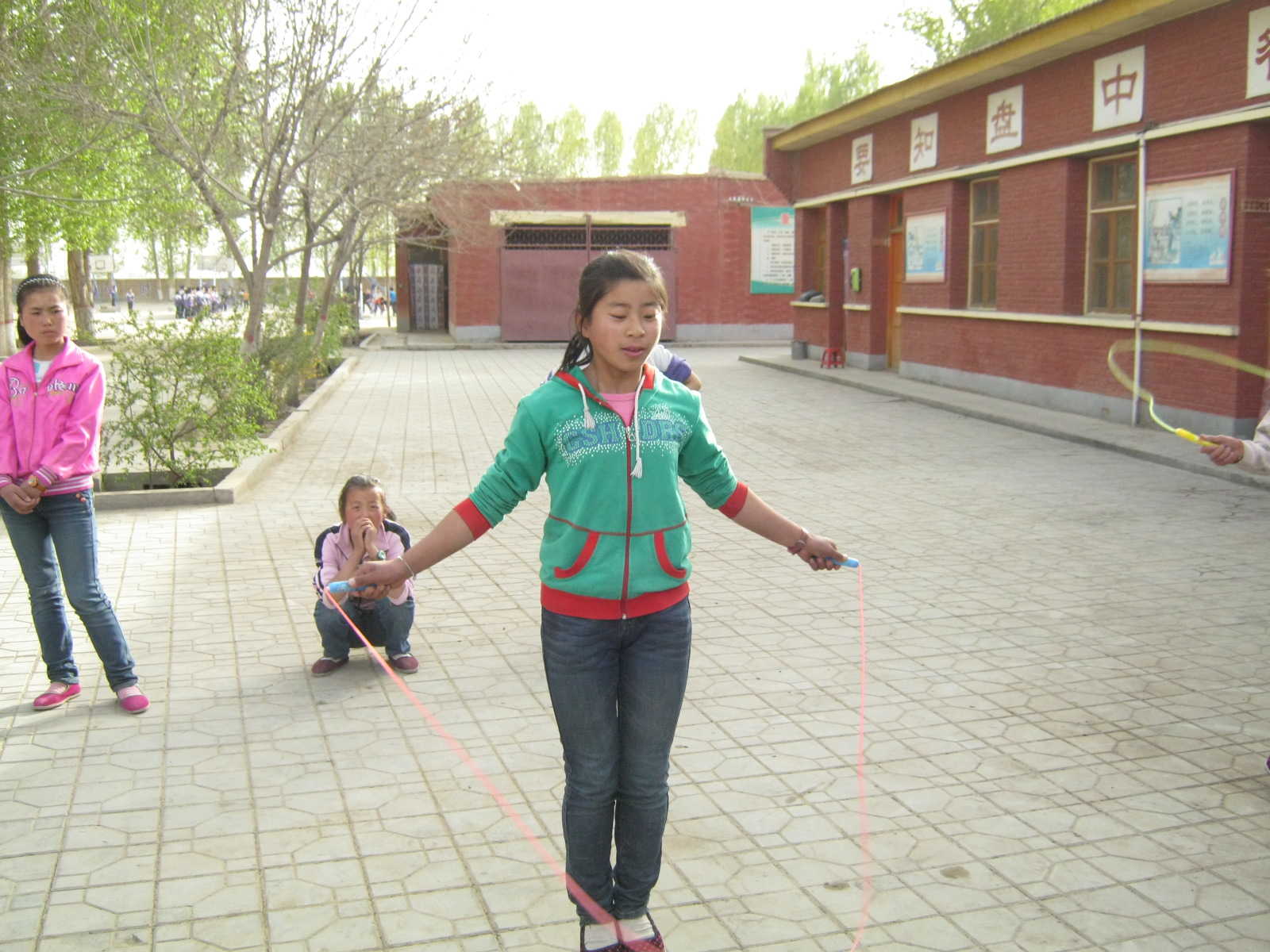 裁判一声令下,我们马上开始,每个人都竭尽全力、坚持不懈、全力以赴,愿为班级争光。跳绳最讲究的不止是速度,而且要求手脚协调,这样才可以发挥到最佳水平。图中的董红艳,把这两点都做得很好,她发挥到了最佳水平。