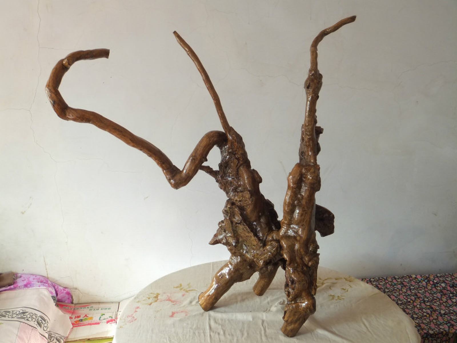 父亲收集的树根有很多,有的加工了有的还没有加工。有一个树根,看起来很大,像一朵珊瑚,非常有霸气。有一个像是经过一场激烈的斗争而断脚的一只龙。还有一个仔细看像两只老鹰,一只大的在上面,小的在下面,活活像是妈妈在教孩子展翅飞翔。