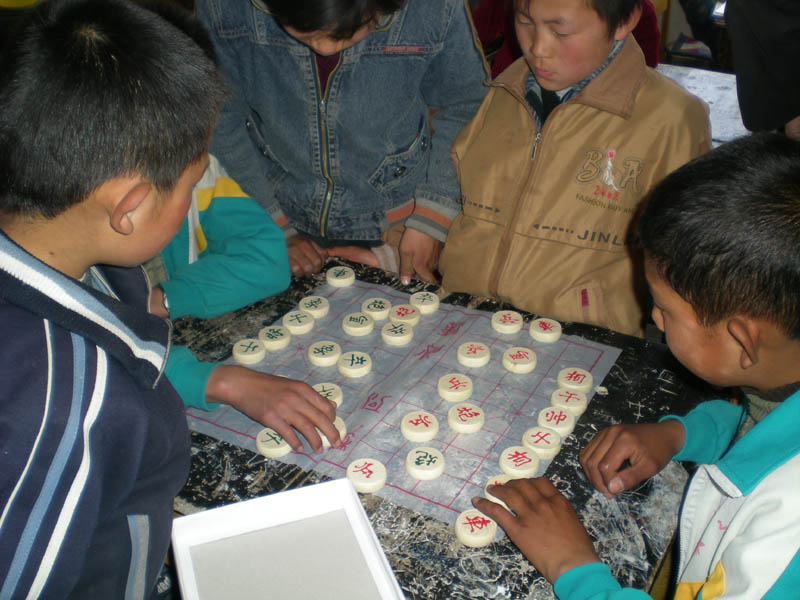 先看棋类组的同学们,这个组的学生比较多,大多是男生。他们玩的棋有象棋、军棋、斗兽棋、跳棋、五子棋。同学们下的好认真,生怕自己一招不慎输给对方。
