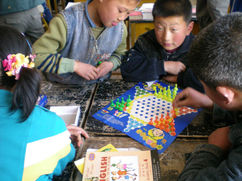 再看这边下三人跳棋的,你跳我堵,仔细寻找出走路线。每个人都很谨慎地走好每一步。同学们玩得好开心啊。