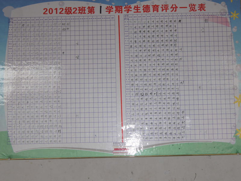 教室内的内置也因每一个班的要求及管理的不同而不同。这个班注重德育管理,他们就把德育评分表搬到墙上,进行公开化管理。每一个同学很清楚明了地就可以看到自己的德育得分情况。