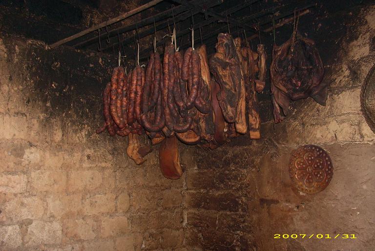 洗净晾干后,就是熏肉了。要熏肉,还要有锯沫,还有一个秘诀就是从柑橘树上摘下树枝,这下就可以进行“火攻”了。熏肉时要把锯沫撒在火上,如果要腊肉更香,就应该把柑橘枝也放在火上。经过一到两天的熏烤,腊肉就算制成了!