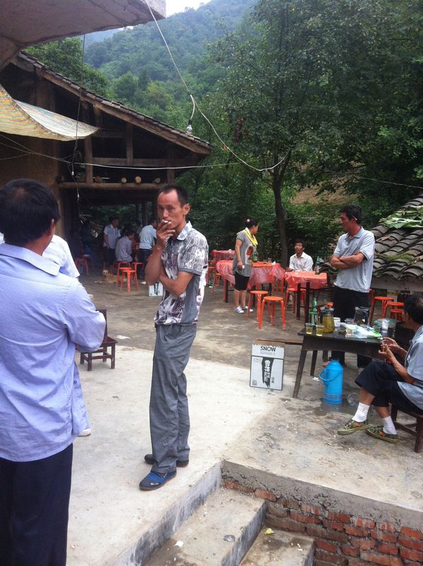 接下来是最有意思的吃酒席,因为我们已经爬了很远的山路。早已经是饥肠辘辘,迫不及待想要品尝美味的鸡鸭鱼肉了。农村吃酒席的场面可谓壮观,在一个很大的场院里搭上帐篷,摆上十张酒菜,大家一边吃一边谈天说地,气氛很是融洽。敬酒的一对新人在大伙儿的祝福声中笑的不亦乐乎。