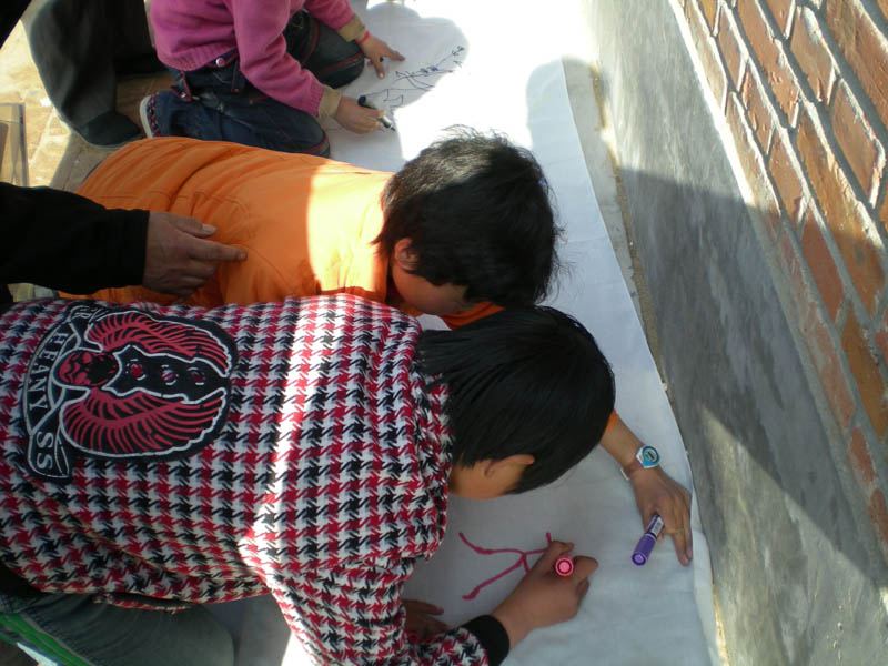儿童活动日是在世界宣明会的赞助下进行的,同学们玩得好开心。这边是涂鸦组,在一块长达10米的白布上,参与的同学可以随意在上面做画、写字。