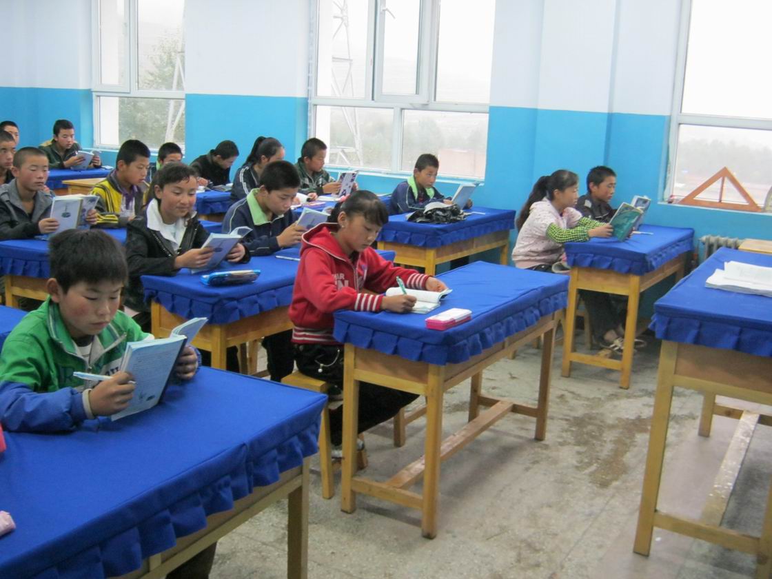 这就是我们的教室,今年我们的教学楼修好了,我们也搬进了宽敞明亮的新教室。你瞧,白色的墙面,蓝色的墙裙,蓝色的桌布,头顶是明亮的日光灯,再也不像以前那样了,天气不好的时候,教室里黑的连书上的字都看不清。
