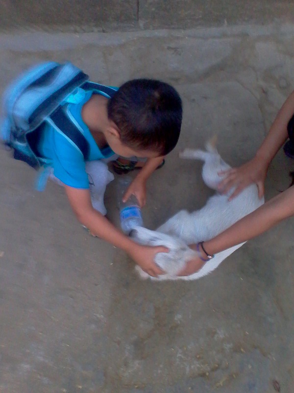 过了一会儿我看见他捉住了我家的那条小白狗把瓶子里的东西硬要给它灌进去了。而他正在自言自语的说:"这下它该不会饿了吧。"看到这儿我都不知道该怎么说他了。
