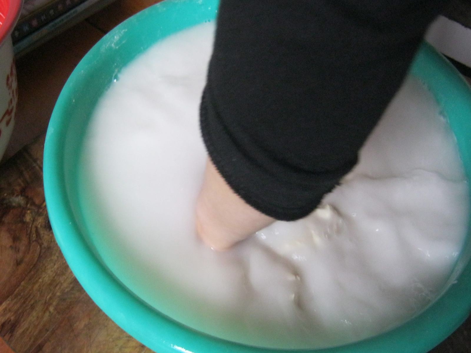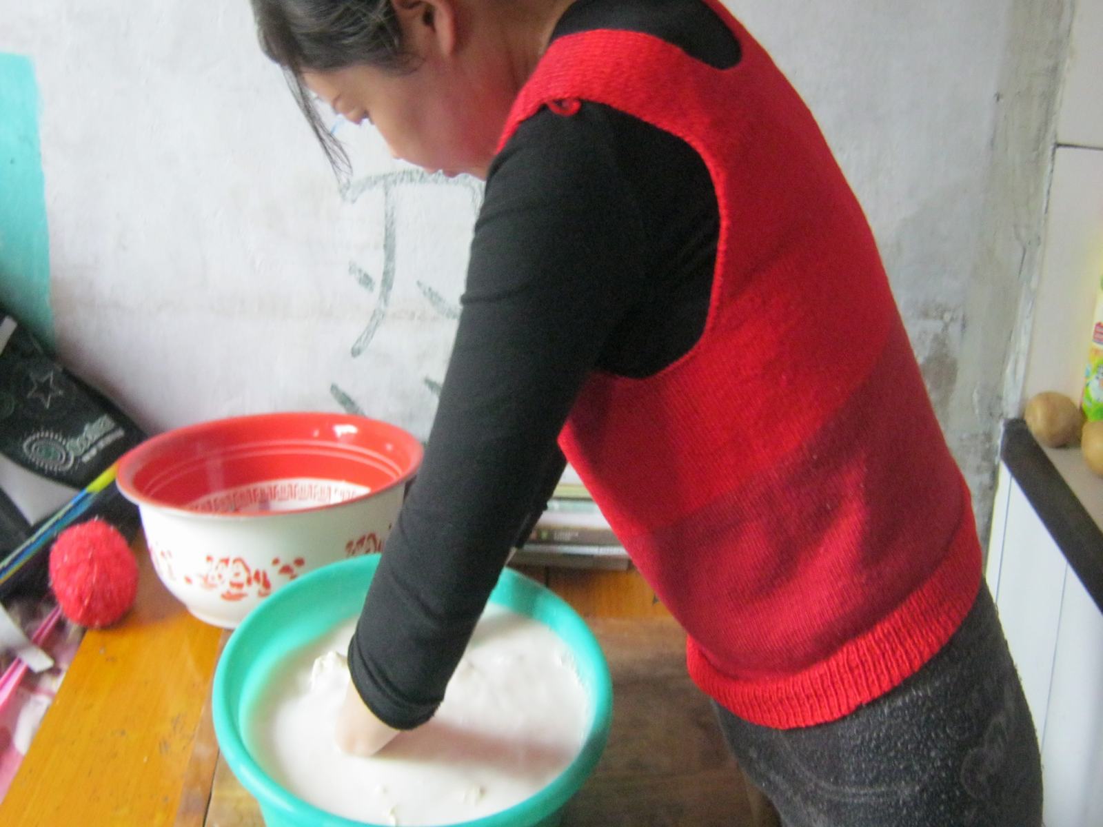 妈妈安排我做一些辅助工作,她自己则做主要的工作。妈妈先在面盆内放上一些面粉,然后用凉水分作两次慢慢倒入面粉盆中,将面粉用凉水和成硬团。然后妈妈把面团包在一块纱布中,在清水中揉搓,这样可以使面粉中的蛋白质和淀粉分离。分离出的蛋白质即是面精,则另外蒸熟,切成薄片,一块放入碗中。