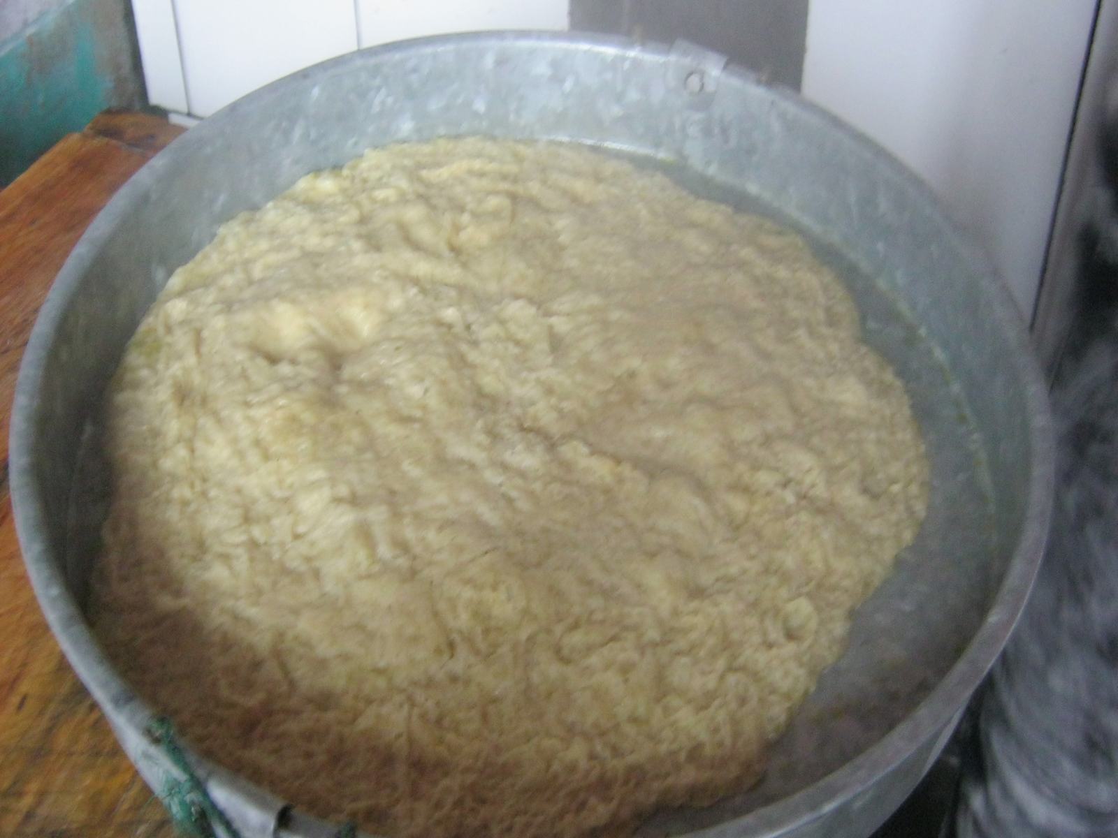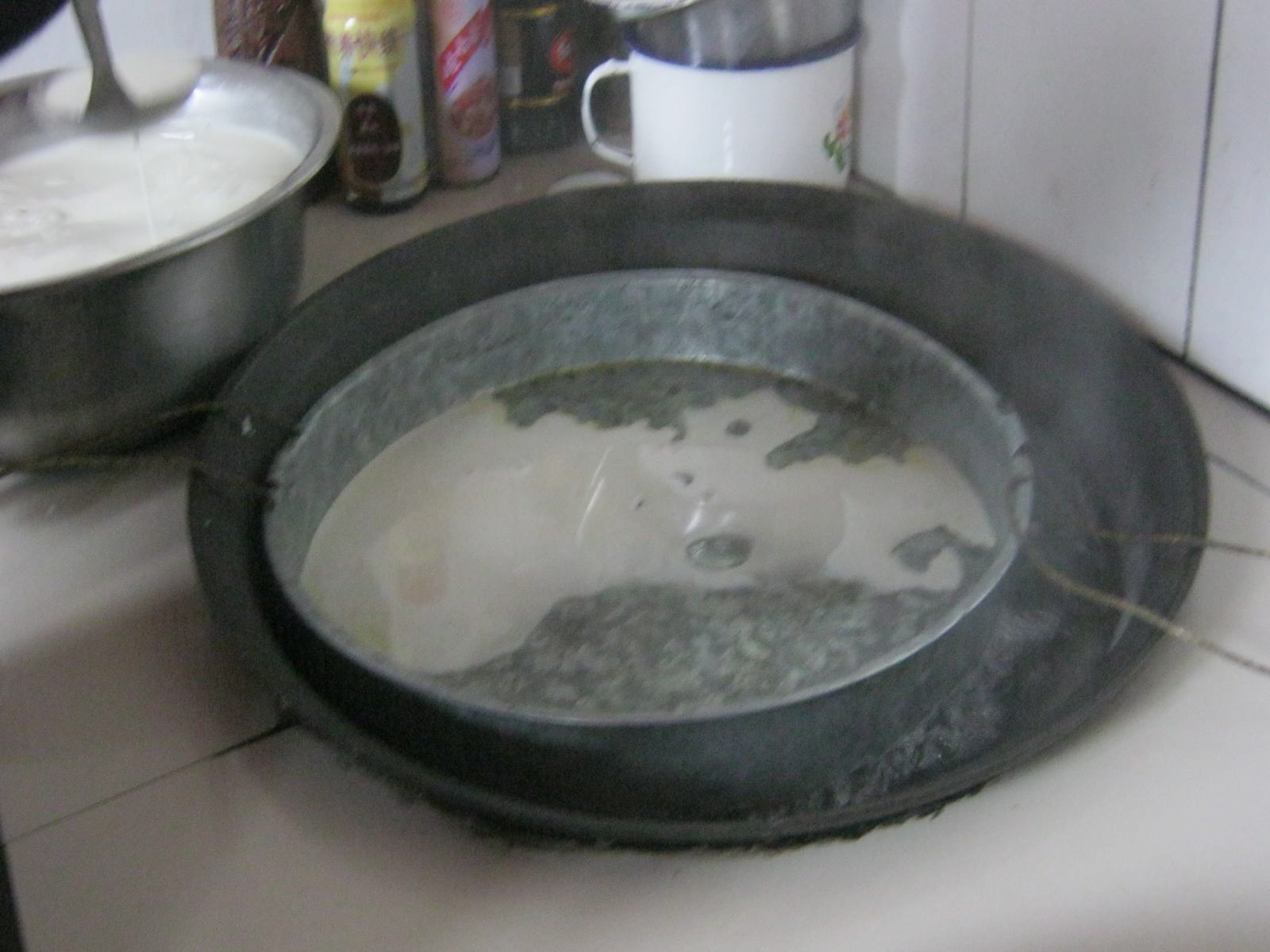 清水中的淀粉就是做酿皮的材料。妈妈准备好蒸酿皮的平底锣,放在大锅中。等水烧开后,拿一个勺子把桶中的淀粉舀一些放在锣中,然后再大火中蒸五分钟左右即可。不一会,一片冒着热气的酿皮就做好了。