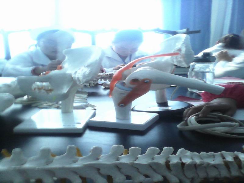 我们上的解剖课是合班课,我们和七班在一起上,大概有一百多人吧。在一百多人的教室里上课,就一个老师。只要有一个人发出声音就音响一百多人上课,我们的同学都很自觉,上课没有说话的。每个人上课都急急忙忙的记笔记,也没时间去玩。一到下课时间就拿手机给那些骨头照相,玩骨头的,睡觉的,聊天的,和老师讨论问题的,干啥都有。