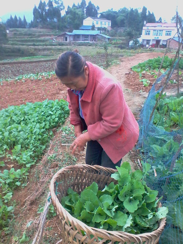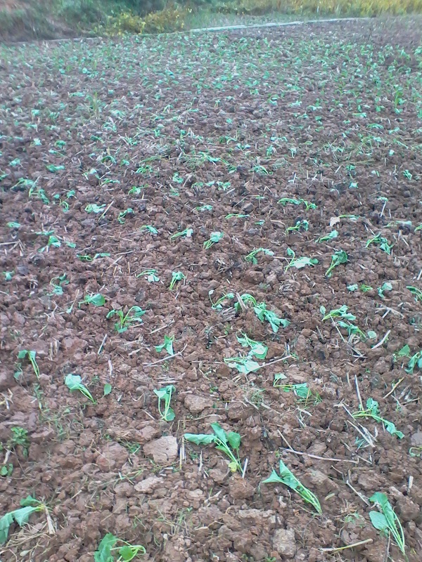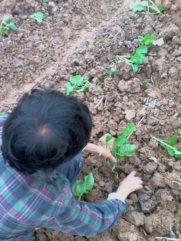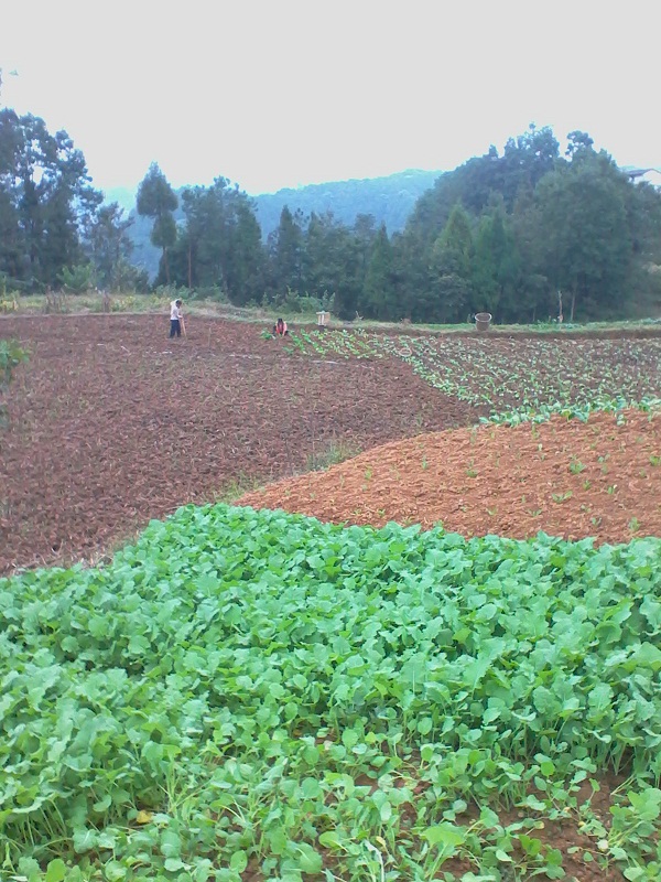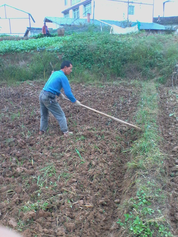 扯好了油菜秧我们来到栽油菜的地方,于是开始了第二步:挖地。地里已经事先耕过一次,现在用锄头把土敲碎一些就可以了。锄好后再用锄头挖一个很浅的坑,这一步就算好了。