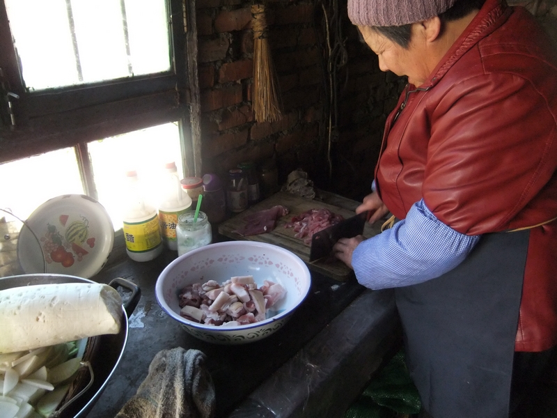 奶奶用糯米面、水和鸡蛋清,把面和好。和好后,就揉成一个个薄薄的面皮。然后开始准备馅料,奶奶把肉、土豆、白菜竹笋切成小丁,放在一个个面皮上,只见奶奶熟练地将馅料包进面皮里,一边转一边折出褶子,一个小巧玲珑又让人垂涎三尺的包子便做好了,奶奶把做好的包子放入蒸屉,蒸40分钟左右便可上桌。