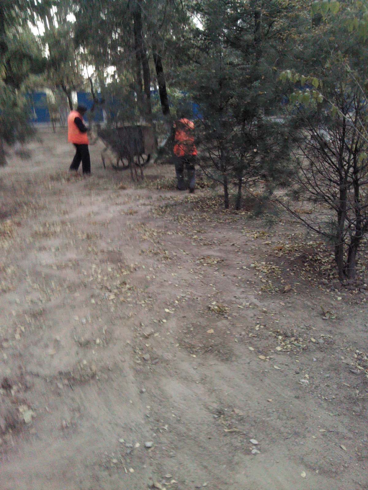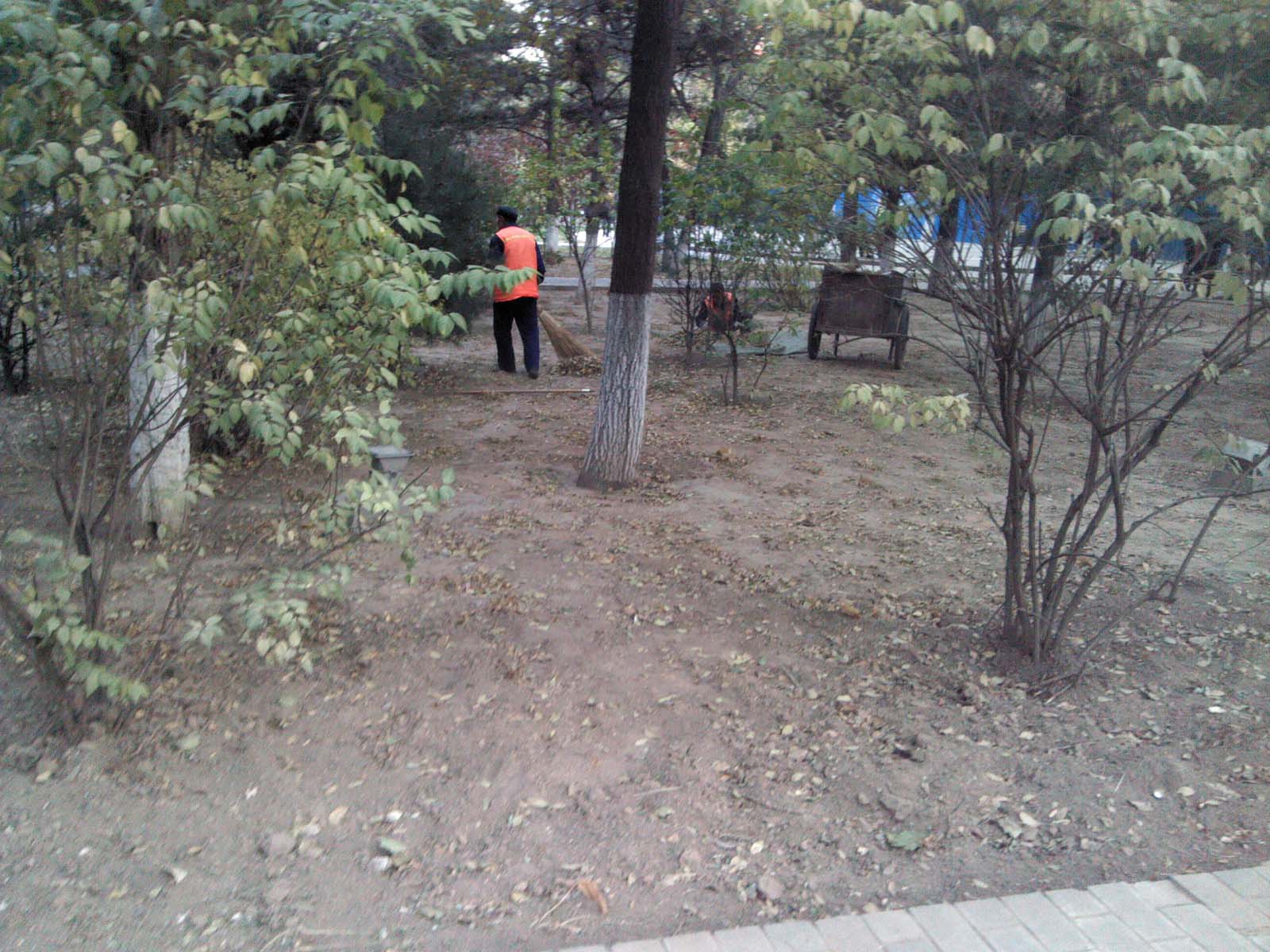 踏上公园美丽的小路,路两旁是高大的白杨和美丽的花草。秋天了,树叶不时地从天空中飘落下来,而地上却很少见有树叶,寻些落叶都哪里去了?猛地发现在树后有几个忙碌的身影,他们穿着黄背心,手操着扫帚、拉着小车,在清扫落叶。