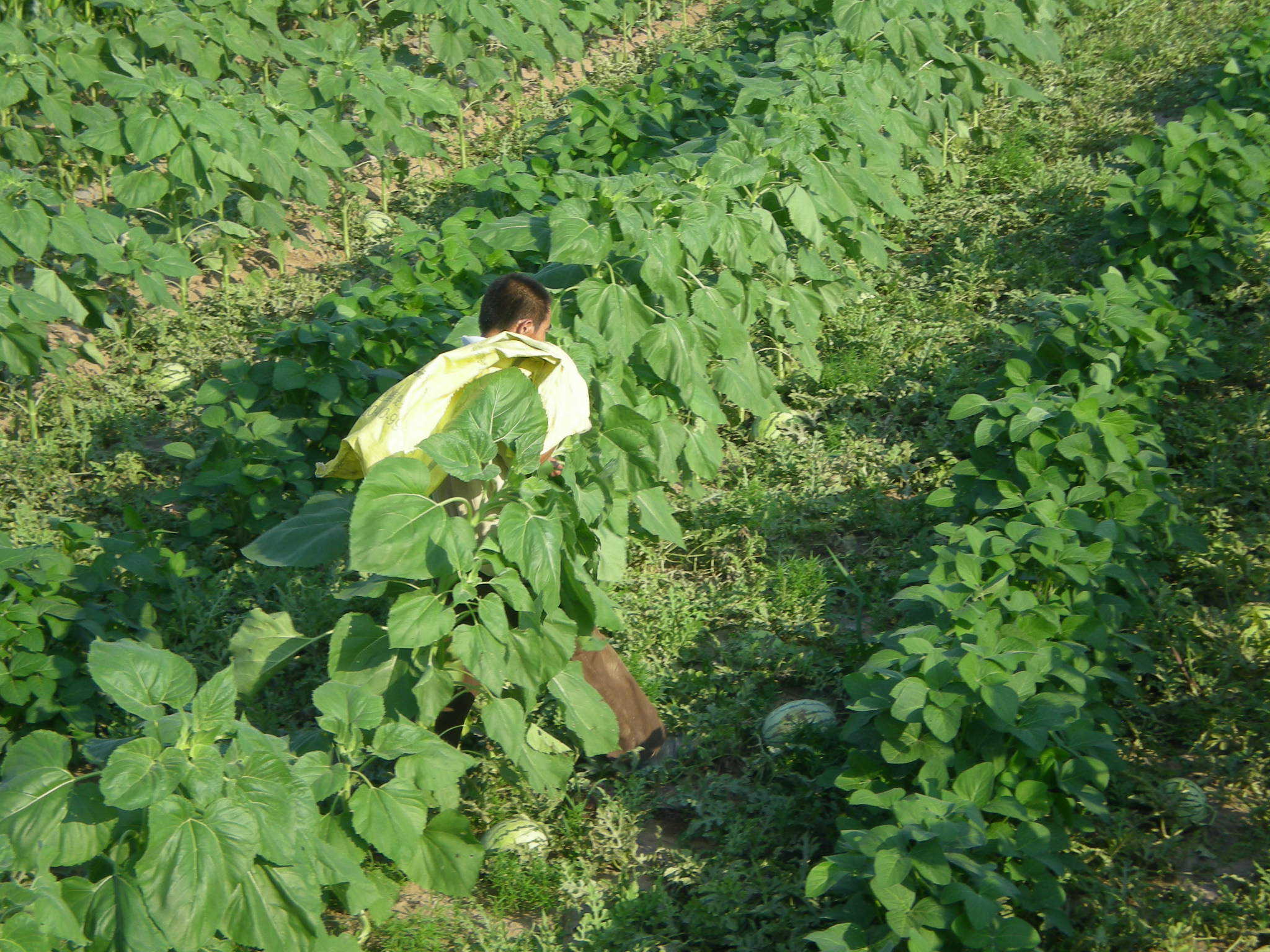 在成熟了的西瓜地里,一个个绿油油的西瓜,好似刚刚出生的小宝宝,在大地妈妈的怀抱中入睡了。婉如一颗颗绿色的星球,挂在松软的大地上。它们一排排整齐的卧在那里,看起来美味极了。