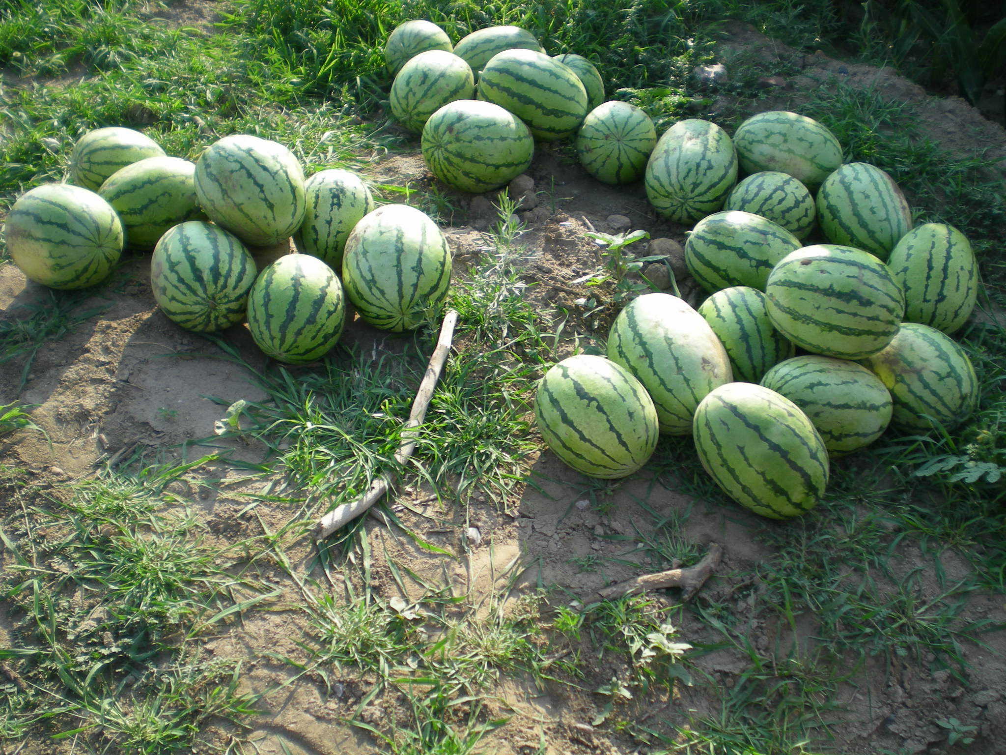 瞧,这一堆的西瓜,个个香甜可口。农民伯伯们一定在交谈今年的收成,比着自家的产量,说着丰收的喜悦。成熟的西瓜大小各异,花色基本相同,都是一条条的绿条纹。