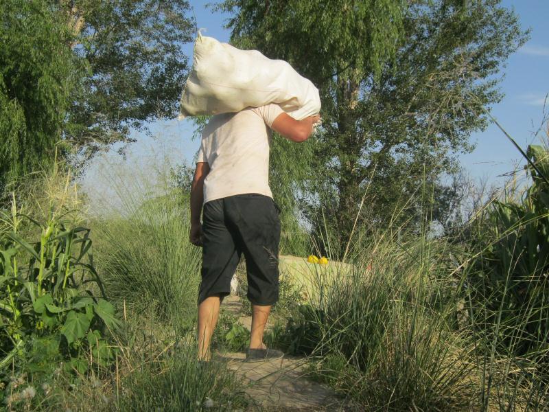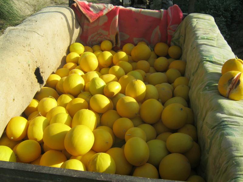 每到蜜瓜丰收的季节,在烈日炎炎下,人们便不辞辛苦地来到地里,小心翼翼地把蜜瓜摘下来,然后用袋子把蜜瓜装好,有人力搬运出去,先贮存到自己家里,等待有了好价钱便运送到瓜市场上去卖。