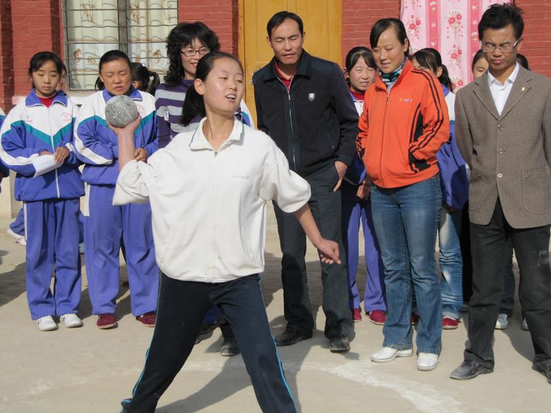 这是我们班的俞晓悦同学,她手里紧握那沉重的铅球,那铅球上凝集了我们的希望。你看她汇集全身的力量,奋力推出铅球,也推出了她理想,她的希望。铅球在空中闪亮,理想在空中发光。加油吧,俞晓悦同学!