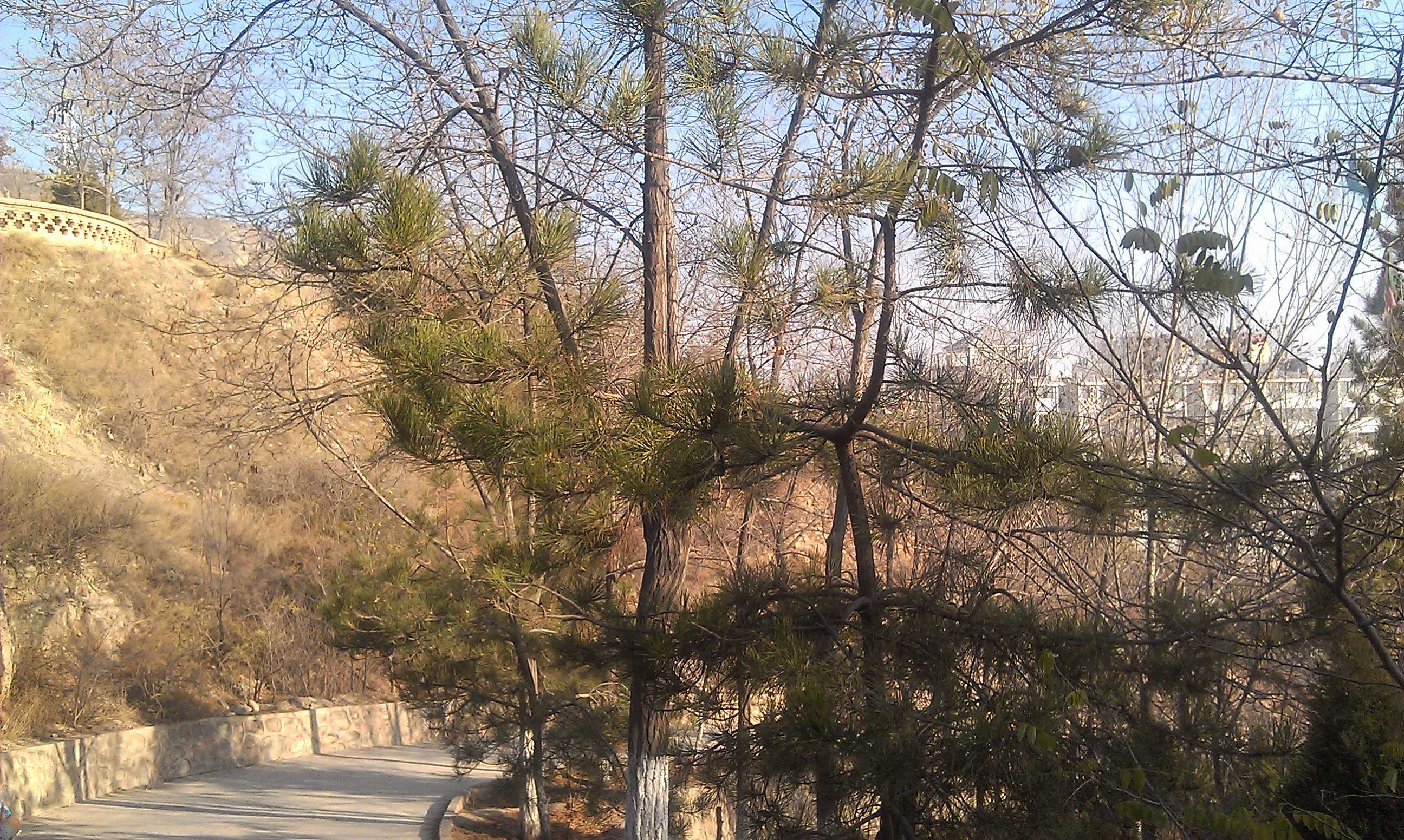 也许是冬天的缘故吧,一路上没遇见多少人,到了北山公园里也没有几个人,感觉很荒凉。公园里的树都显得土苍苍的,树上的叶子黄黄的,但是还有很多没有落。还是松树和柏树坚强,还披着绿绿的衣服。