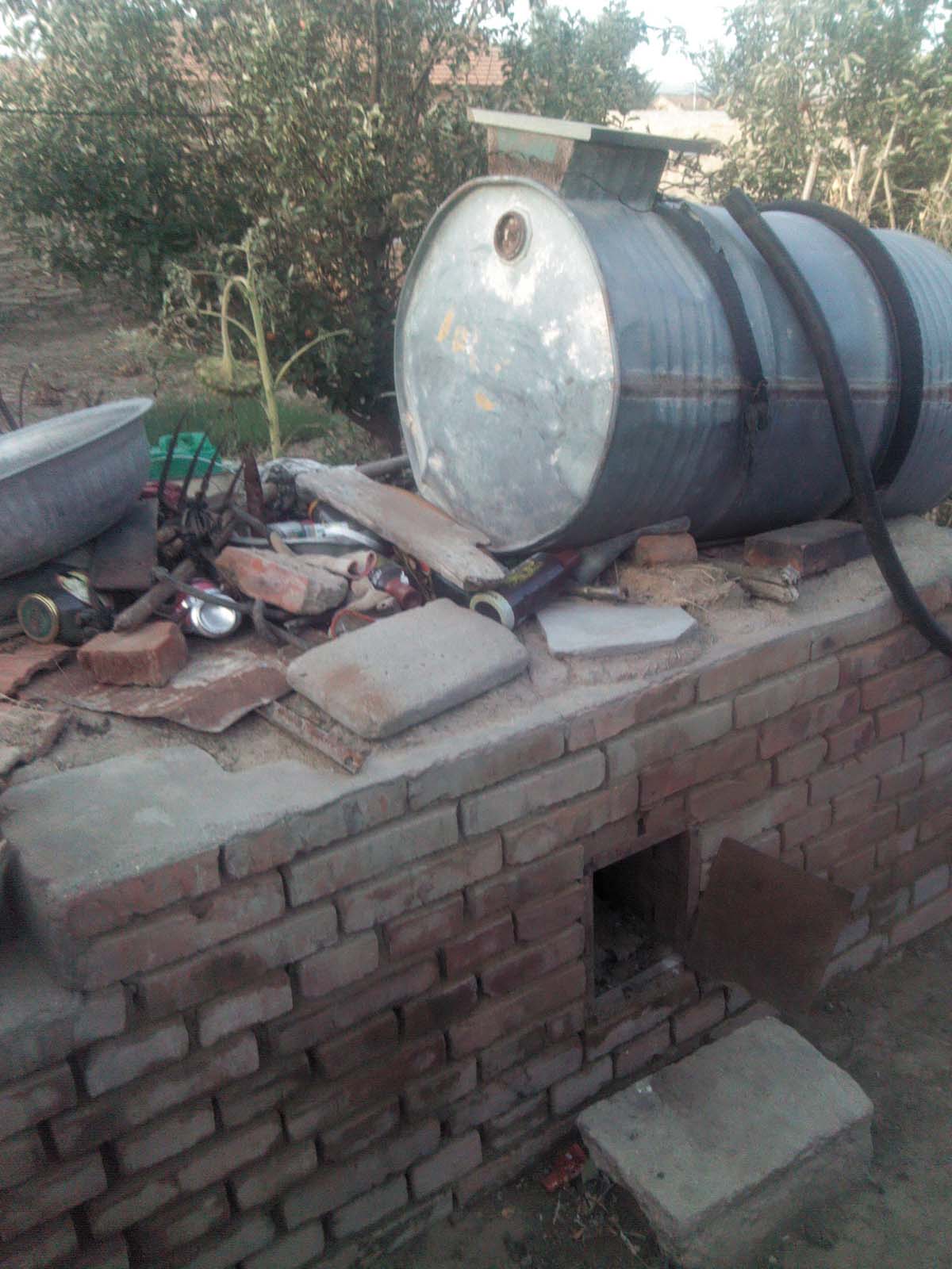 自家没有井的也在想着办法,他们把一个大油桶改装成一个大大的水桶,放在小推车上。去有井的人家去拉水,拉一桶两块钱。这一大桶可以装好多好多水,一个星期也用不完。