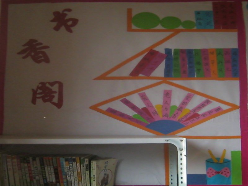 当然,我们的"书香阁"也不能小视哦。我们"书香阁"采用逼真的立体设计,而且在整个教室的布置上也是合为一体的,不像其他班级这一块总是显得有一点单调,而且分裂,这样就彰显了我们班别样的特色。