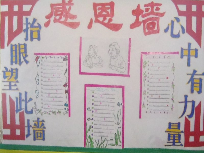 最后,让我们满怀感恩之心来看看我们的"感恩墙"吧!在教室侧面的墙壁上,我们进行了"感恩墙"的设计,我们想让同学们懒惰时,想想我们辛苦劳作的父母,想让同学们"抬眼望此墙,心中有力量。"因为每个人都有懒惰的时候,可贵的是总能在懒惰的时候再打起精神来,坚持下去,我们就能获得成功。 怎么样?为我们美化"小天地"的行动鼓掌吧!