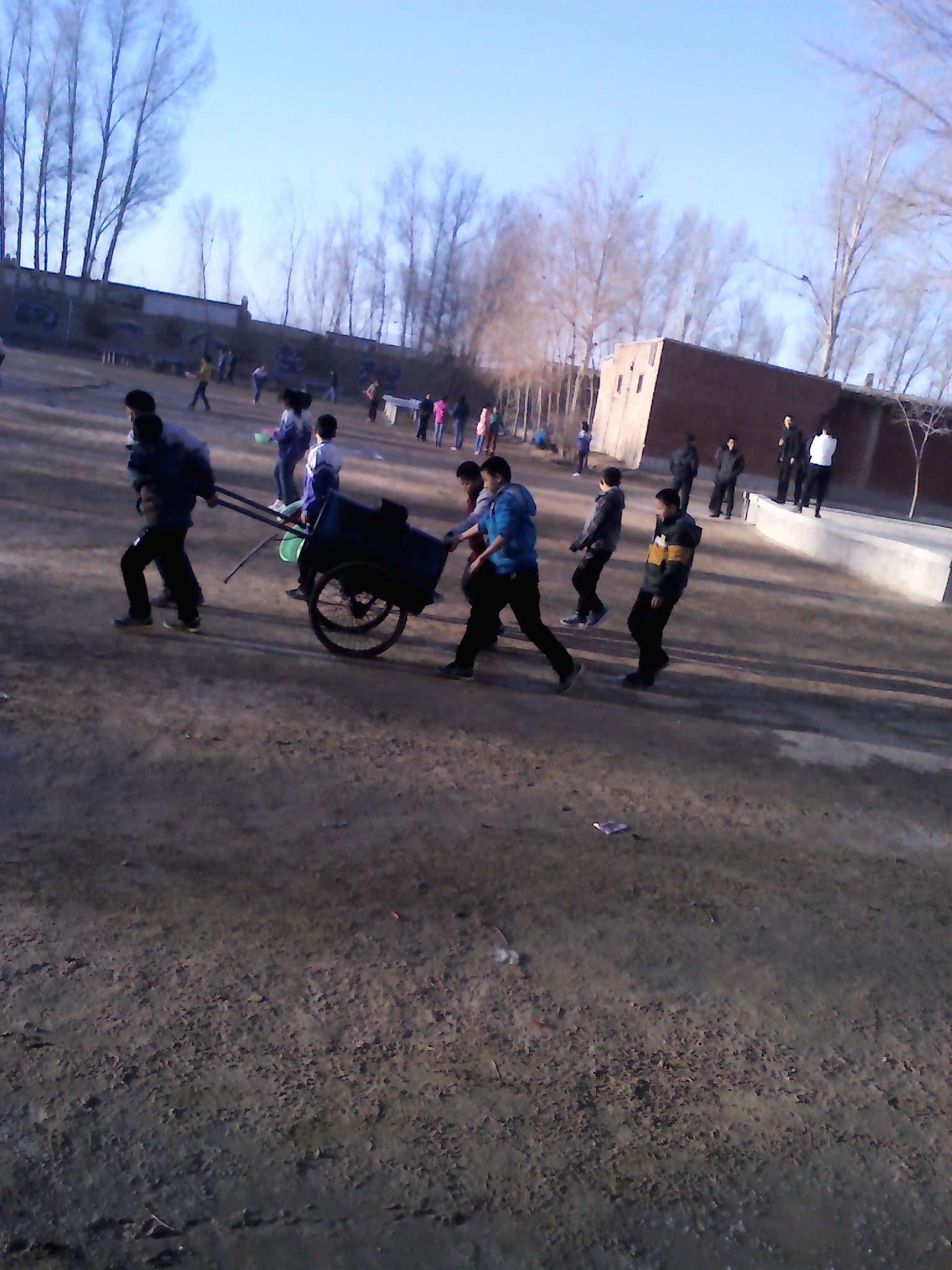 同学们深受浮尘的危害,一直在酝酿一个不受尘土困扰的方案。 终于,在一个温暖的中午,我们全体同学认为:该给操场"洗洗澡"了。"开始!"生活委员一声命令下,同学们便如火如荼地干了起来。