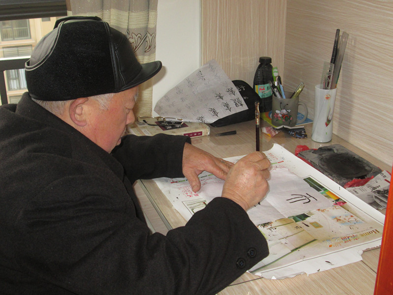 记得那会儿,我总爱看着袁爷爷写毛笔字,那时可能是不舍得钱买纸吧,他总会拿来一些废弃的报纸一类的东西当纸,在上面细心地一笔一笔的写毛笔字,而这个习惯他一直延续到今天。
