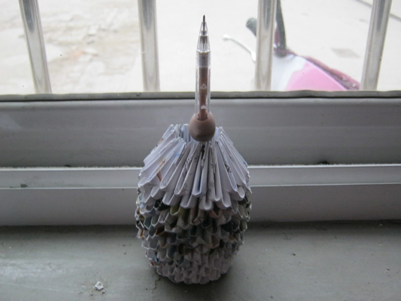 首先,把这些纸裁成统一大小的长方形小纸片,然后用一张小纸片折叠,然后反过来在折叠,就这样反复几次,一张纸被折成了一个小小的纸,有点像三角形,剩下的纸依然如此,最后将这些纸一个又一个连起来。就这样一层又一层地叠起来菠萝笔筒就做好了。
