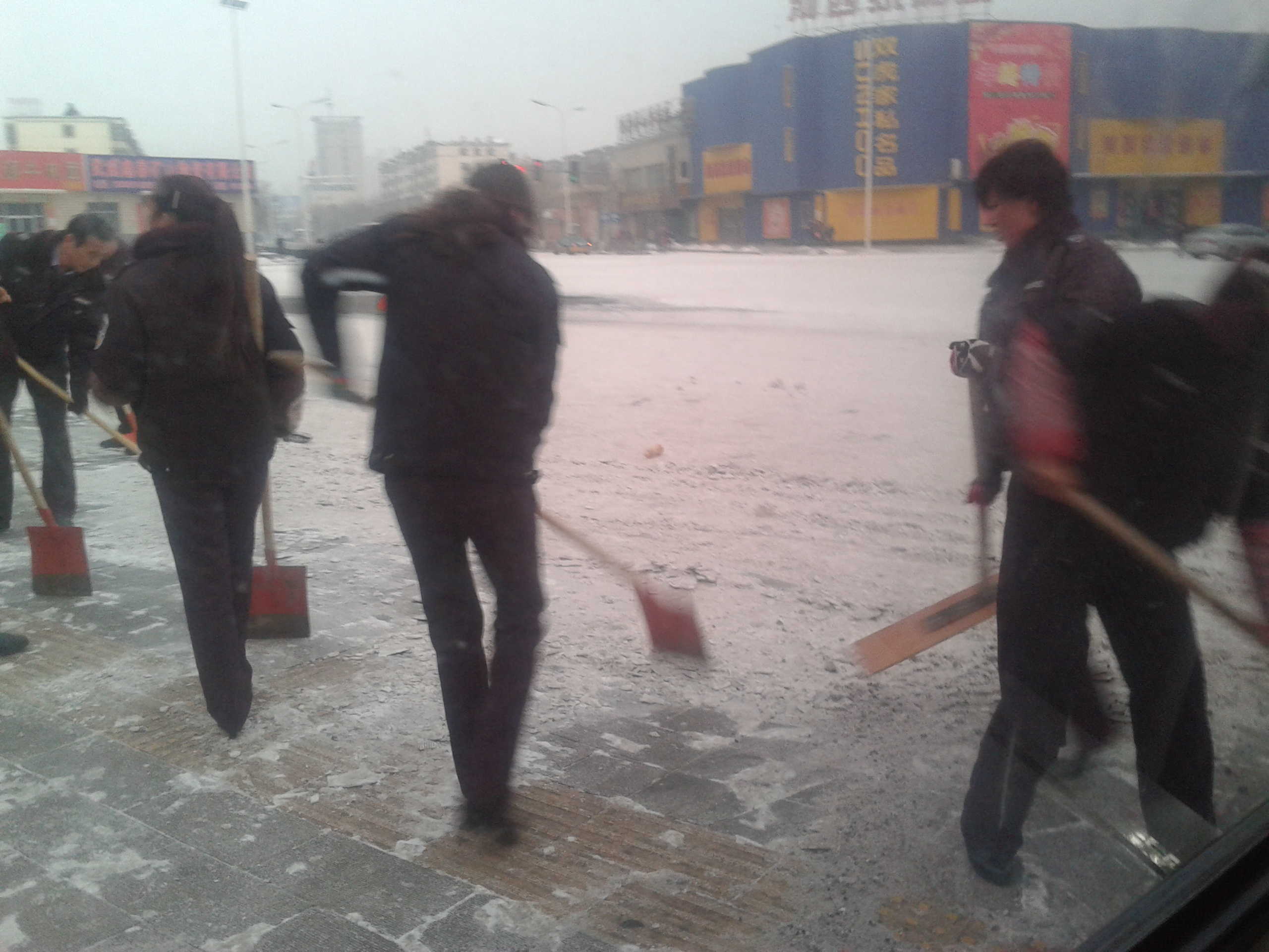 人们用铁锹猛烈地磕着地下已经僵硬的雪块,铁锹剁地的清脆响声荡漾在雪地之间。拿着扫帚的工作人员挥舞着手中的“毛笔”绘出地的本色,骑三轮车的工作人员把除掉的雪堆在一块放置。