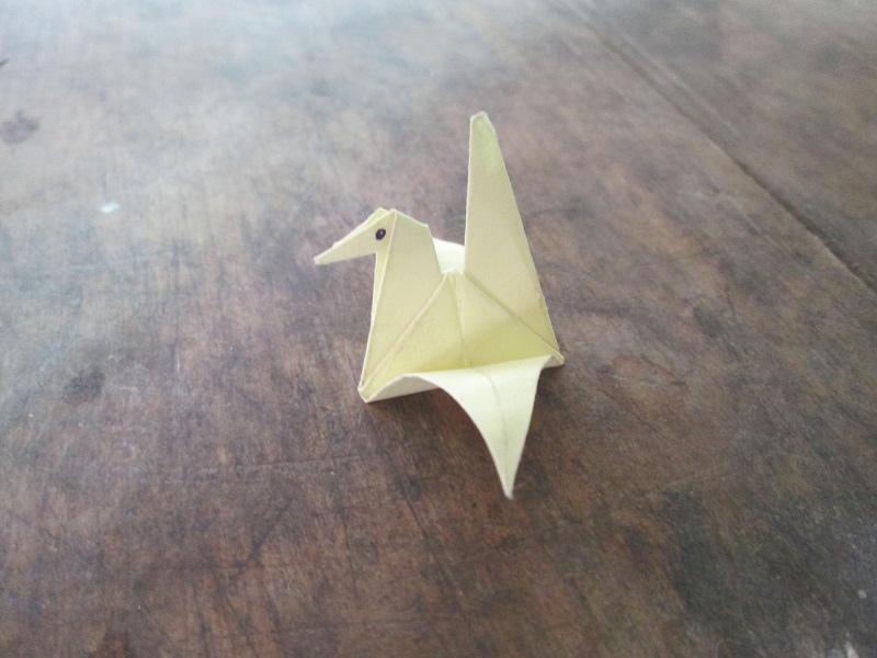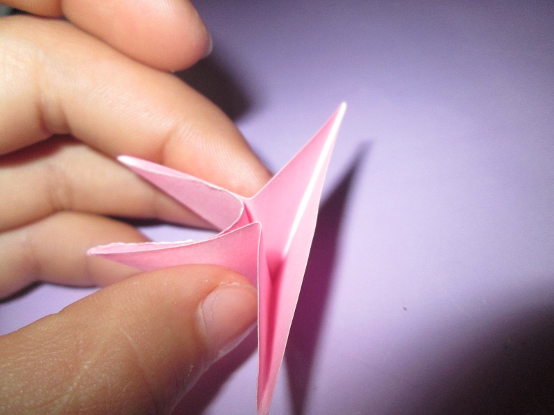 千纸鹤的制作过程我们已经完成了一半。现在到了最难的部分了,第一步是一只手拿一个角,往里折,注意,要把千纸鹤每条棱捋清楚,这样可以让千纸鹤更美。现在看起来像一朵花,华一共有四片花瓣,把这四片花瓣叠过去。现在已有一对翅膀和一条尾巴了,只剩下头了,把那个角往里斜对折,就OK了。