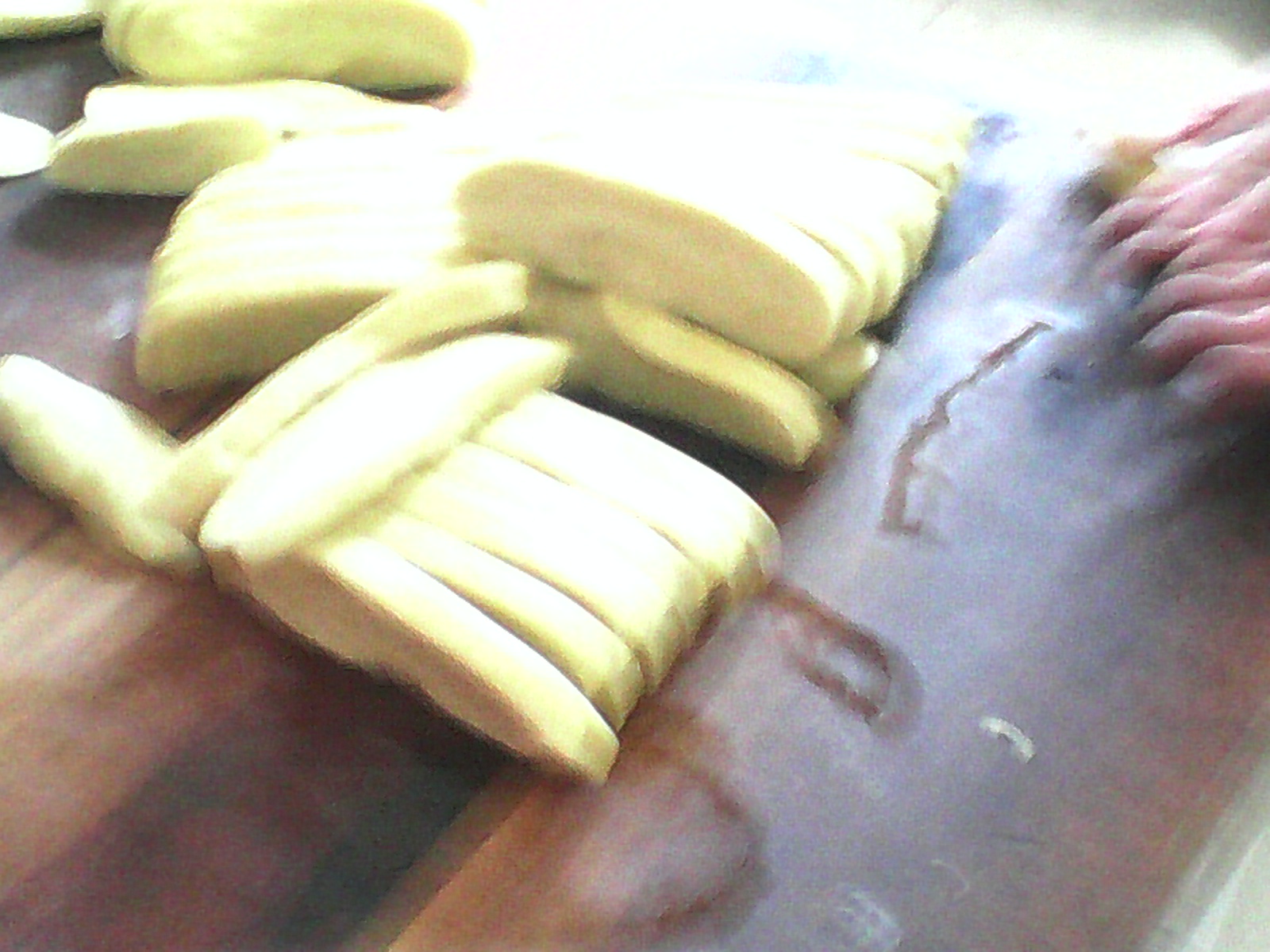 再将面切成约十厘米的长条状,分别揉匀,将揉好的面团彻在一起,连我堂堂大男生都揉了一块儿,虽然做起这项工作来有生硬。揉好的面团并不如妈妈揉的那样光滑,却也能勉强过关了。