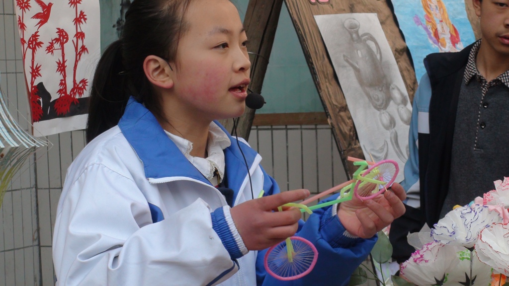 这是我们班的解说员,阮心怡。她朗诵能力非常强,所以代表我们班做解说员,他手中正拿着,魏昕同学做的"自行车",怎么样是不是很有意思呢,这是由废旧的吸管所作而成的,将废品回收利用起来,可见这是花费了她多大的心思啊。