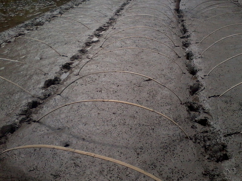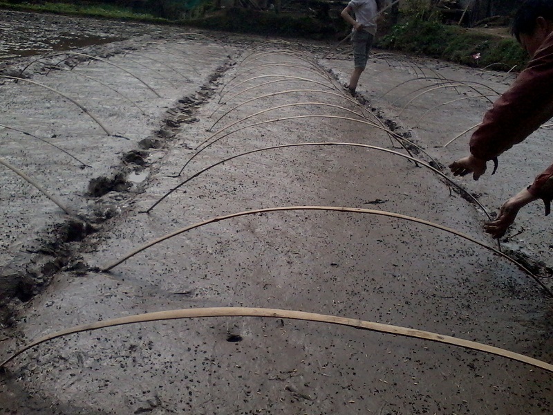 接下来,外婆把事先准备好的竹条放在岸上,我负责给他们递,外婆和叔叔就负责把竹条以半圆的形状插在泥土上。竹条之间不能离得太近,等秧苗长出来了,就会伤到秧苗。竹条的作用是给谷子足够的空间生长,因为谷子才长起来,得需塑料膜保护着,所以竹条一定得有韧性,不然就会在插的过程中被折断,并且要结实的插在泥土中。外婆和叔叔迅速地将竹条插完了,并且插得十分工整美观。