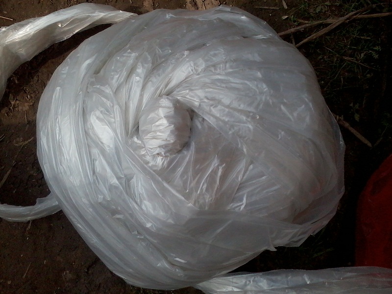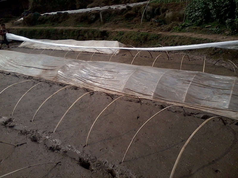 然后,取适当长度的塑料膜铺在半圆形的竹条上,塑料膜的作用主要是在谷种生长的过程中起到保护和保持温度的作用,以免大风大雨伤到它们。就在外婆和叔叔给谷种"施加保护"时,不料一阵大风吹来,塑料膜难以完整地铺在竹条上,最后,等风停下来以后,塑料模才得以铺好。铺好的塑料膜就像一个个白色的帐篷一样,好看极了。