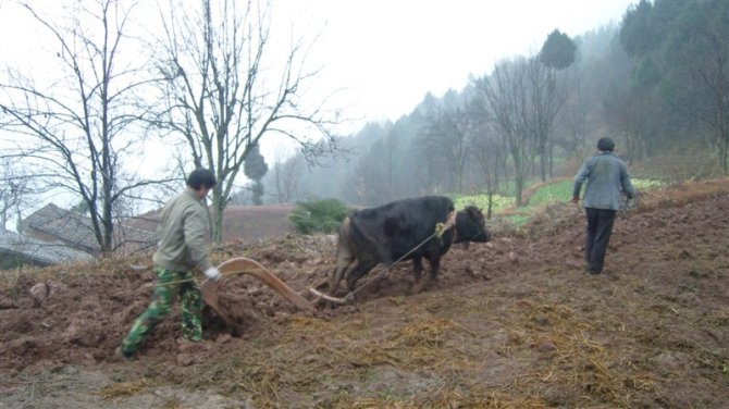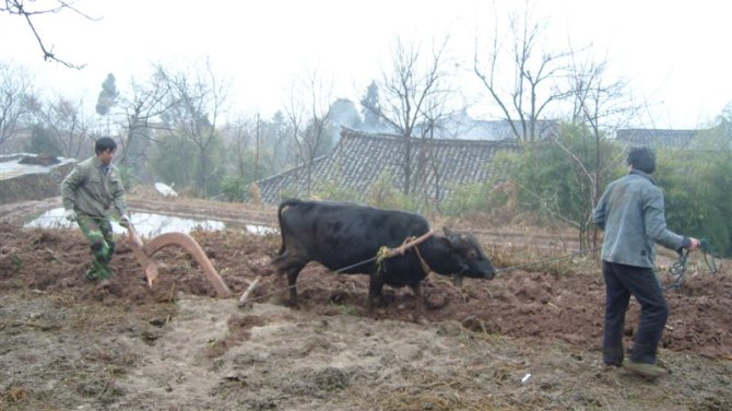 这个是小牛拉犁,这是一头从来没有做过这差事的小牛,所以在它拉犁时还要一个人在前面给它引路,不然的话它会乱跑,耕牛注定一生是劳碌地为它的主人劳作。尽管它还有些吃力,但是来年它就更强壮了,就能承担起它的职责了,而我们呢,现在是父母辛勤地哺养我们,而我们什么时候还能回报自己的亲人呢?
