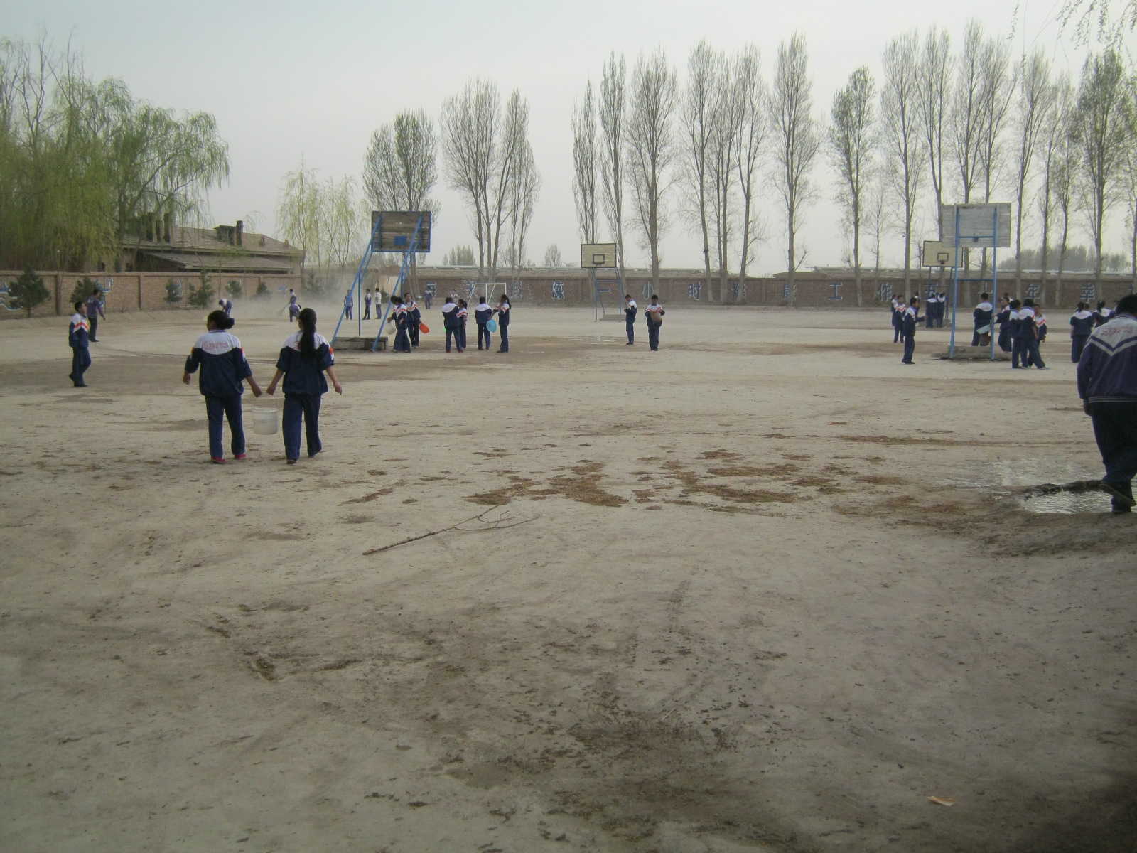 没有抢到洒水车的同学,只好端着盆子洒水。虽然比较慢,但同学们都争先恐后,没有一个偷懒的,尤其是女生,劳动积极性空前高涨。不管别人干什么,她们毫不在意,心中只有一个目标,把我们活动乐园中的灰尘消灭干净。