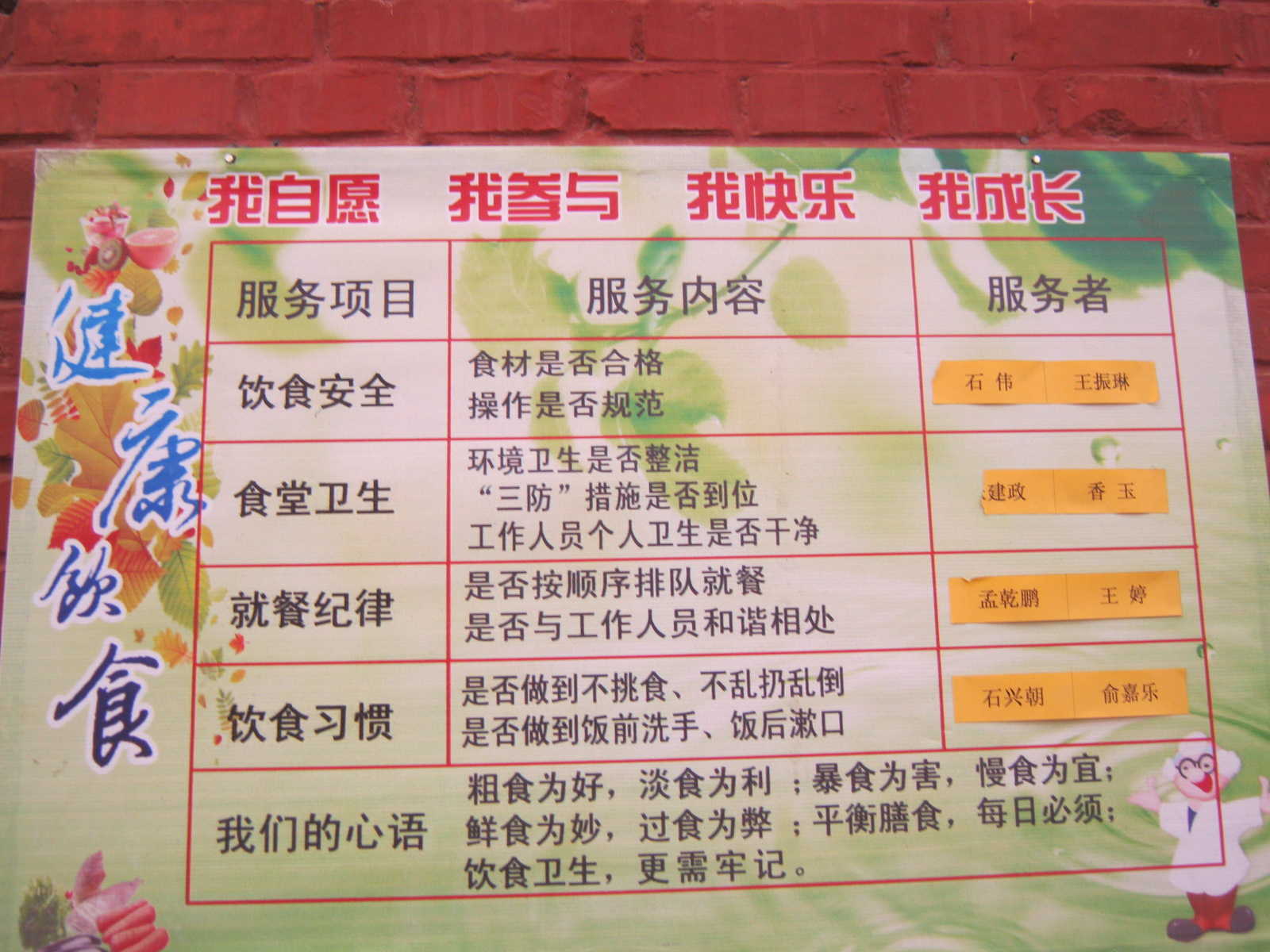 餐厅东墙上的"浪费可耻,节约光荣"也变成了健康饮食。服务项目有:饮食安全、食堂卫生、就餐纪律、饮食习惯等。每天都安排学生为我们服务,当然就是我自愿,我参与,我快乐,我成长!