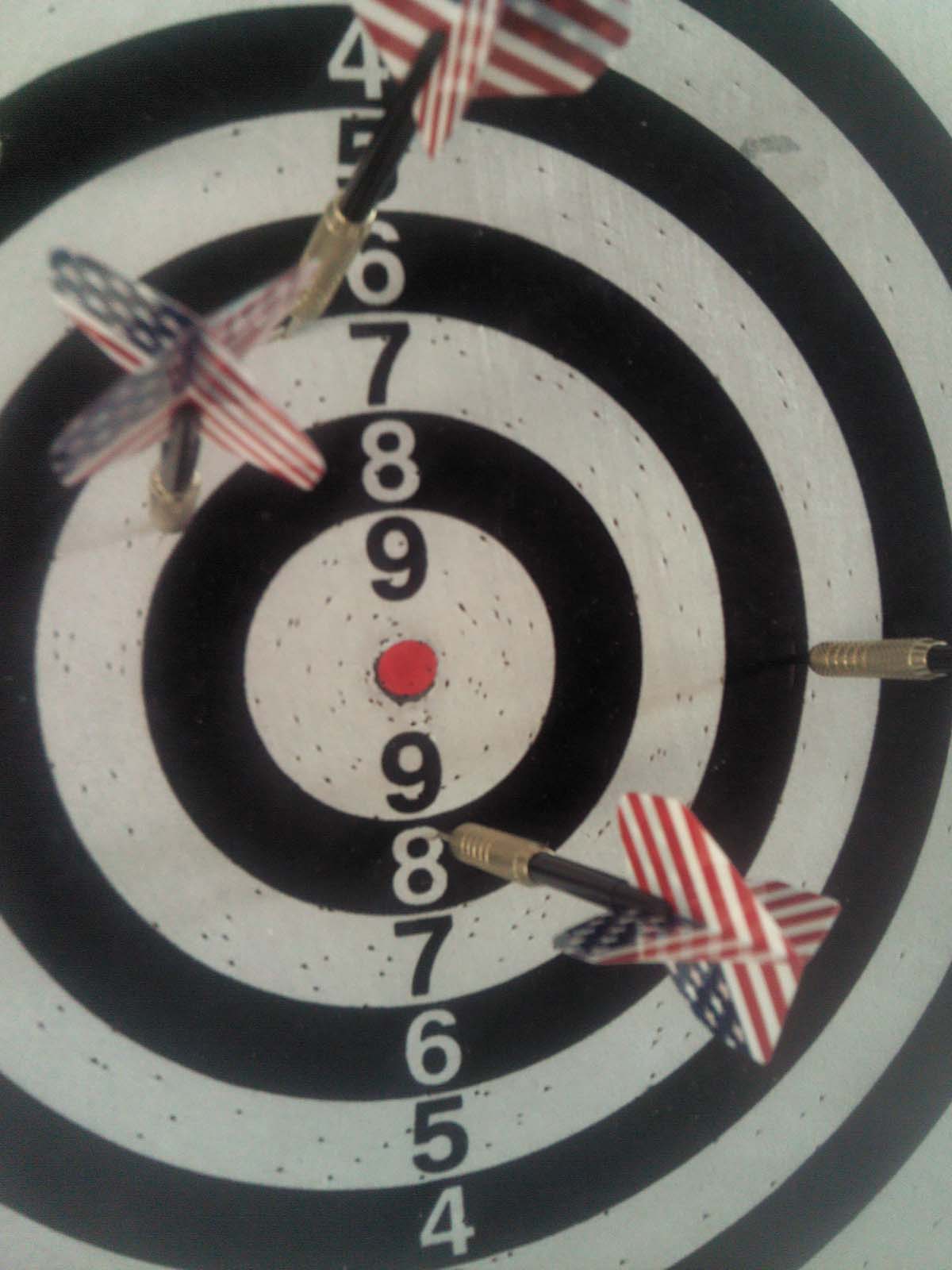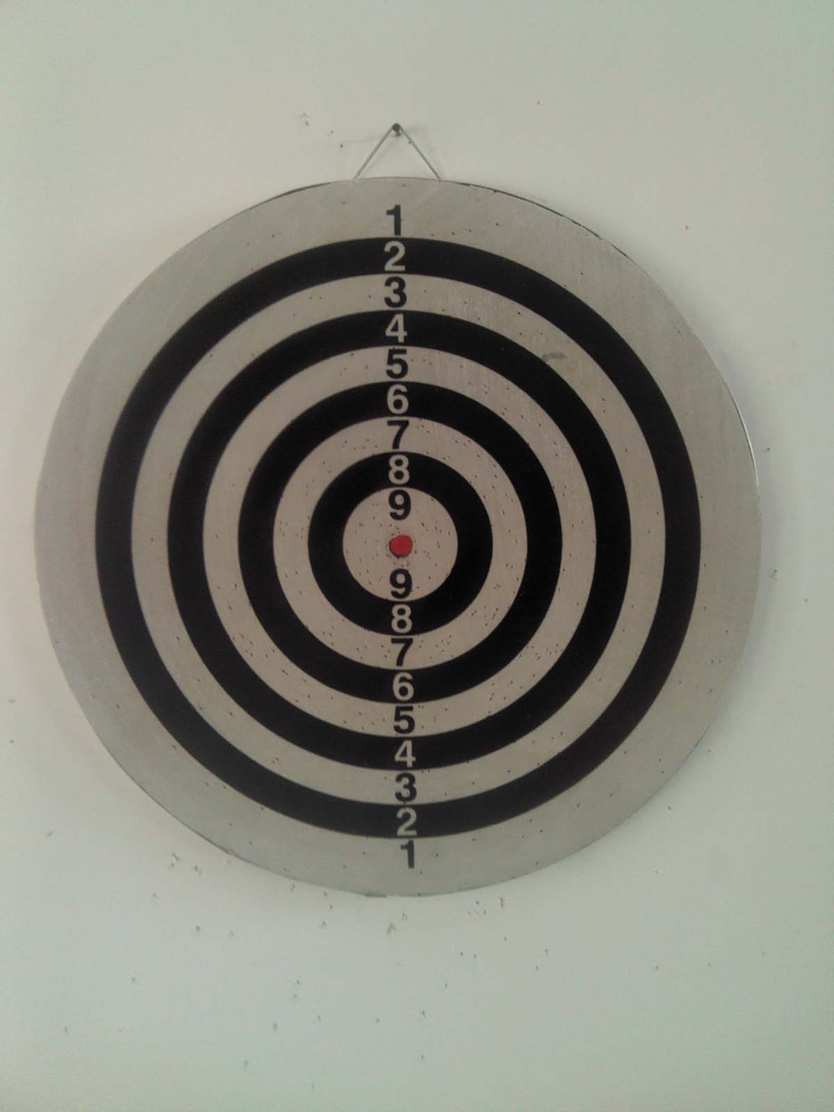 我再不敢粗心大意,眯着眼盯着靶盘,一手插腰,一手捏着镖,慢慢忽前忽后品着手劲,争取打在盘上呀。觉得差不多了,镖出手,这次没敢用力,镖半途就掉下来了。哎哟,练个投镖这么难啊。我没有灰心,不停地练着,终于可以扎在盘上了。但成绩还不是很好,最好成绩9环。