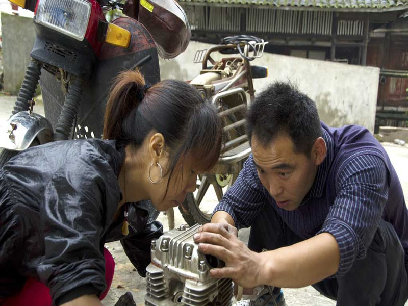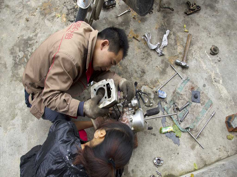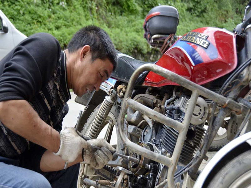 看到叔叔和阿姨那么认真地蹲在那里看着那些零件一点点的为车主排出安全隐患,有时他们这样一蹲就是一上午,有时连饭都顾不上吃。因为我们这里是山区代步的工具基本上都是摩托车,可是山路上布满的都是石子和石头一不小心车胎就被弄破了,下雨天山路湿很容易出事,镇上的人都不富裕一辆摩托车基本上就是家里值钱的东西了,坏了都舍不得换,所以在这里很需要叔叔,他就这样在这里帮镇上的人修好了一辆又一辆的摩托车。